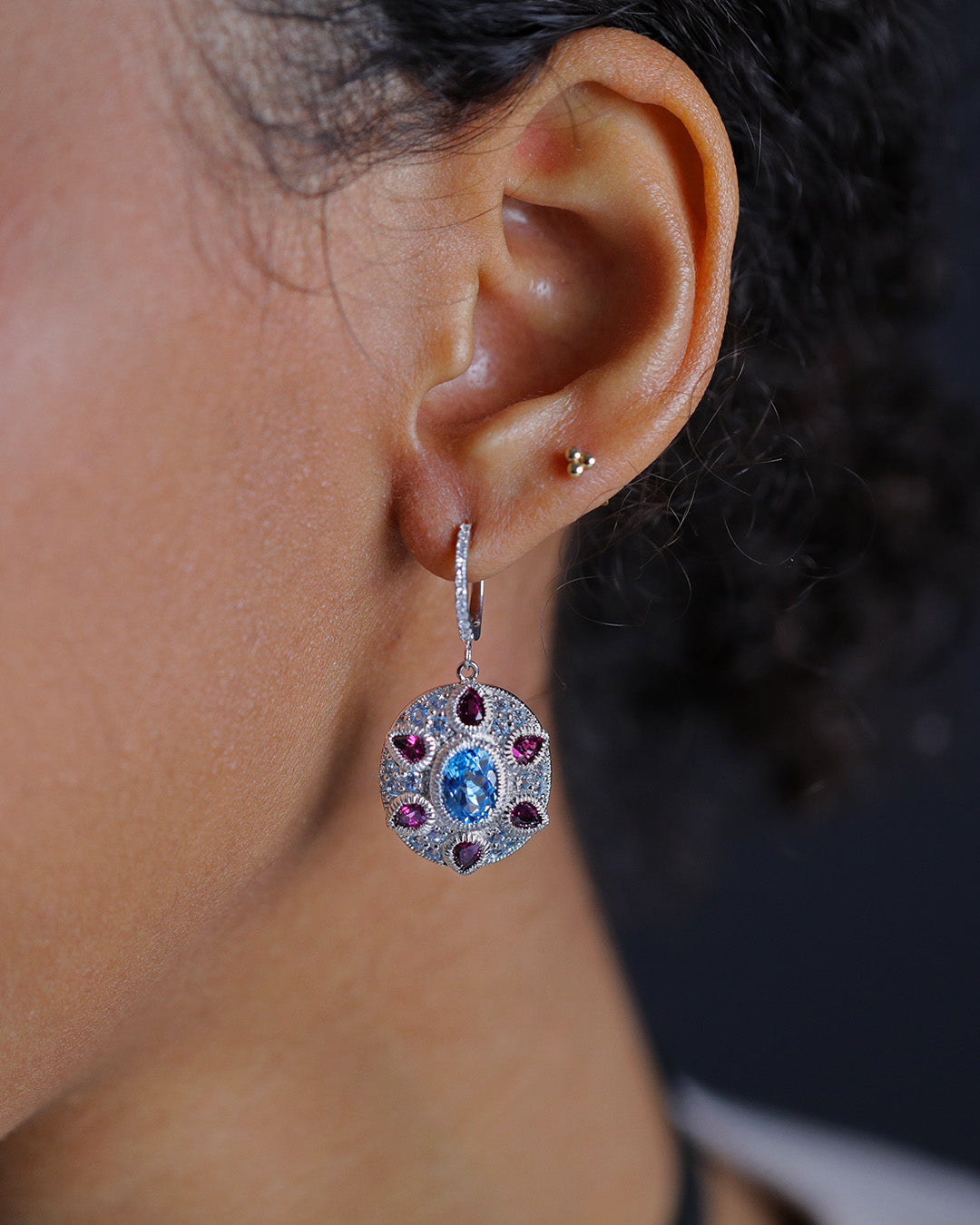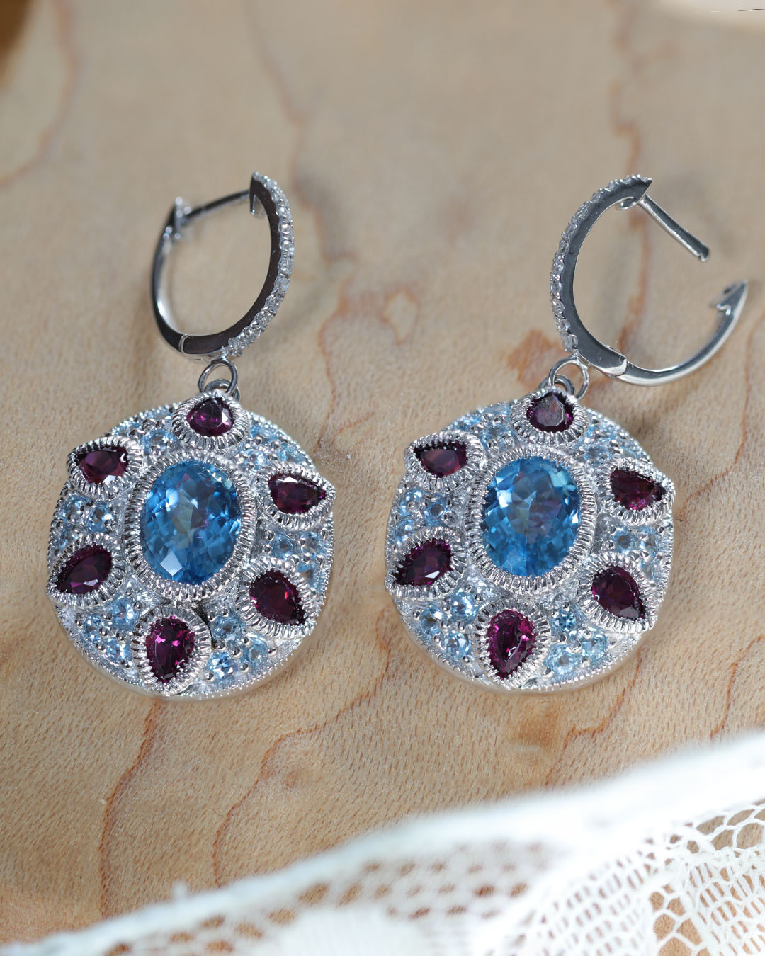 Elevate your ear game with these stunning 14K white gold earrings, where brilliant blue topaz meets deep garnet in a fancy oval design. Weighing in at an impressive 3.97 carats of blue topaz, these beauties deliver serious sparkle with a playful personality. Perfect for adding a pop of color to any look, whether you're dressing up or keeping it casual.