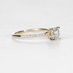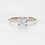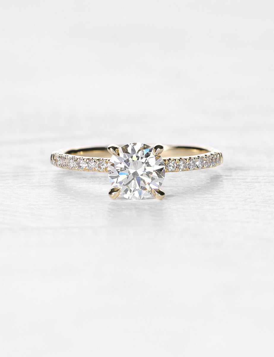 The Buttercup showcases a round cut set on a diamond accented band with hidden halo.