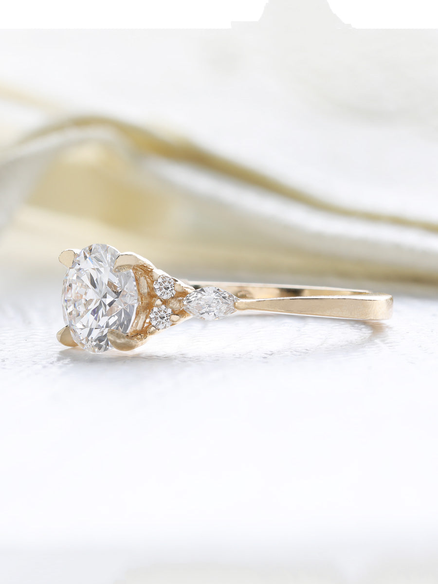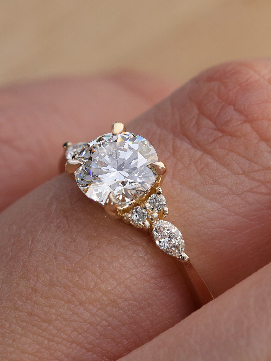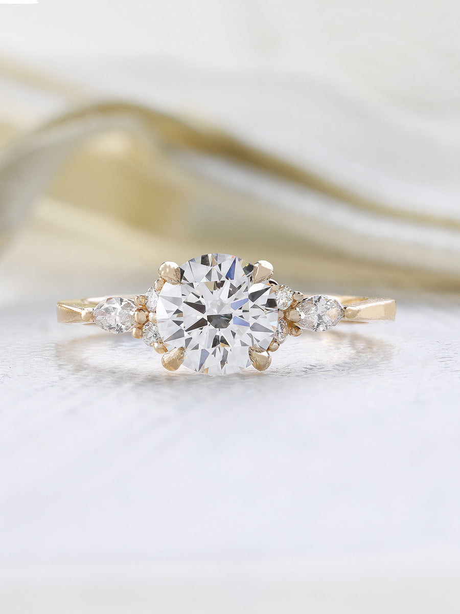 This elegant ring features a cluster of round and marquise-shaped diamonds that rest upon the shoulders of the slightly tapered band. The center stone is held by four claw style prongs.