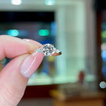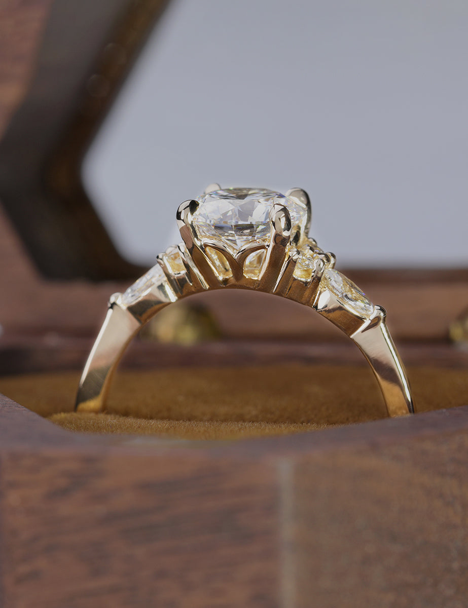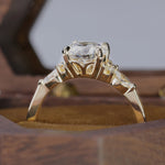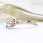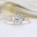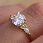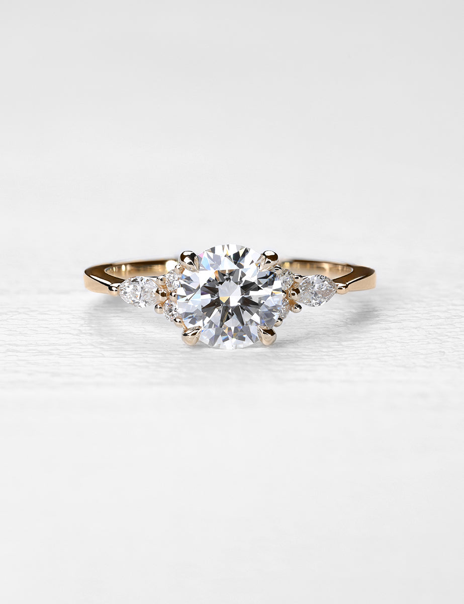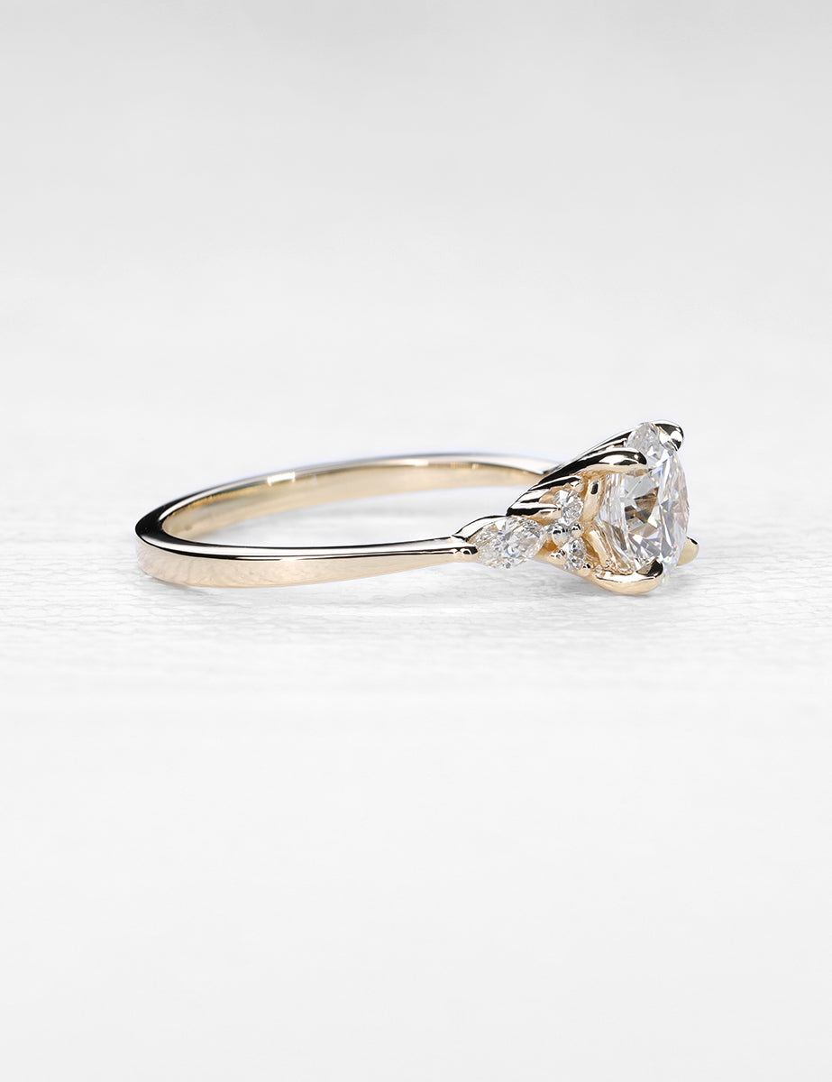 This elegant ring features a cluster of round and marquise-shaped diamonds that rest upon the shoulders of the slightly tapered band. The center stone is held by four claw style prongs.