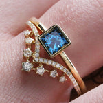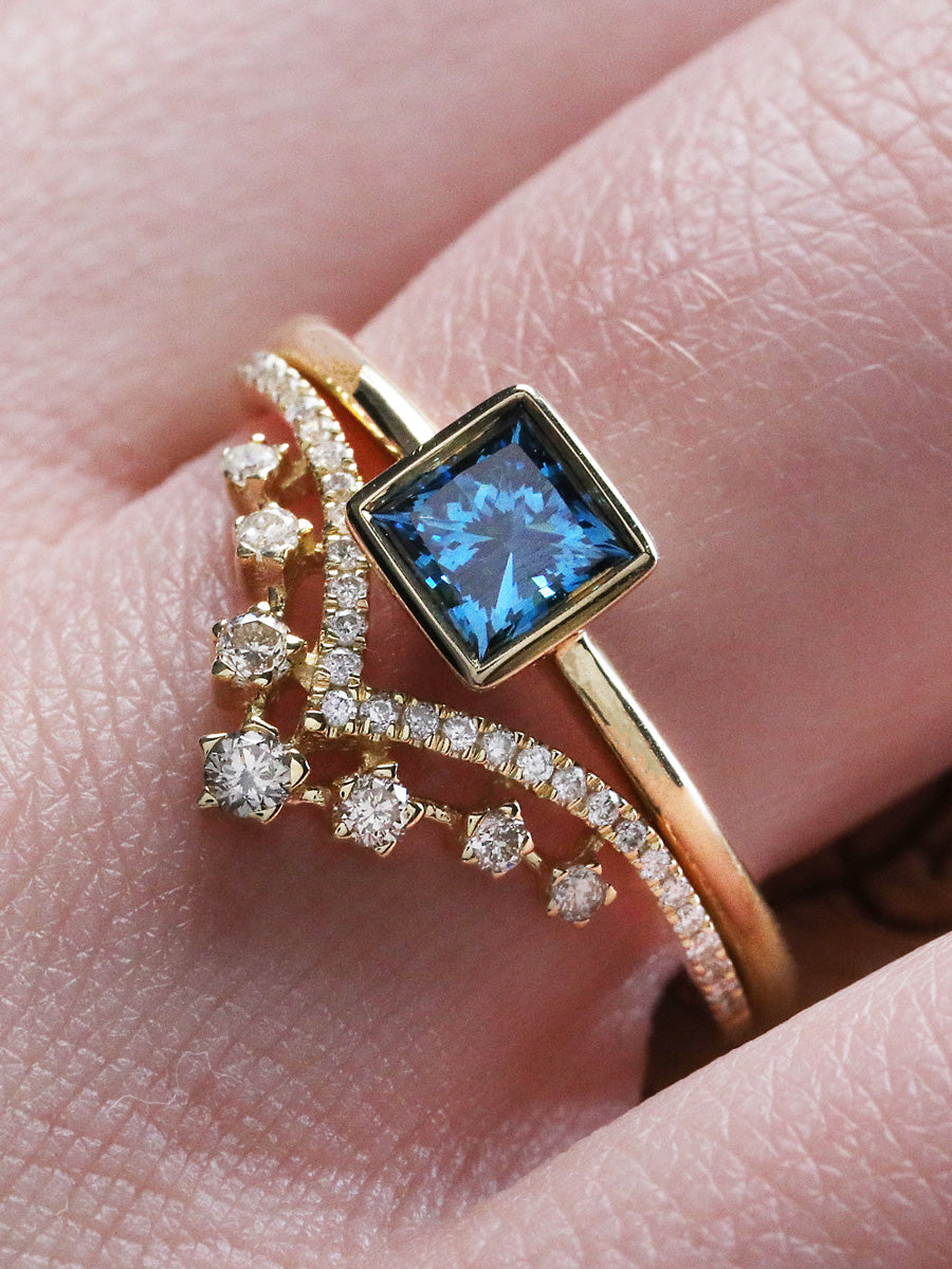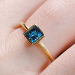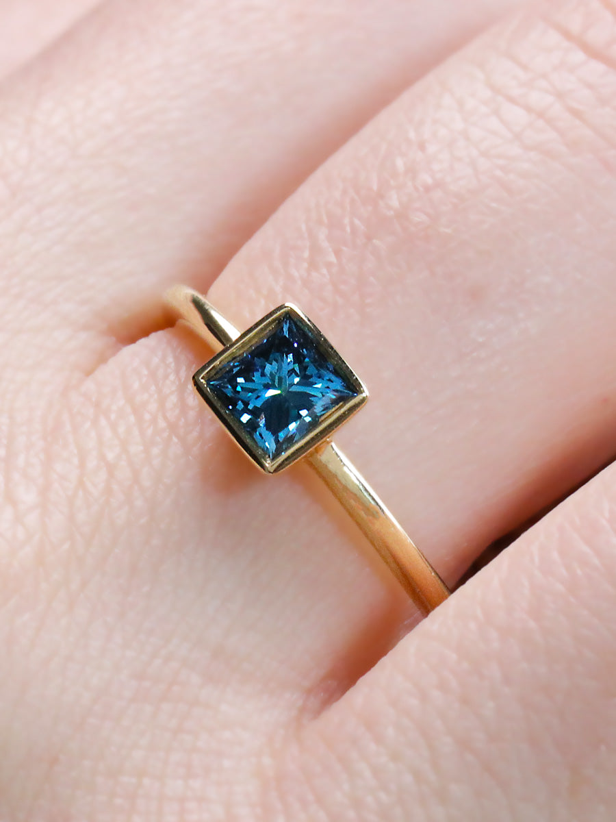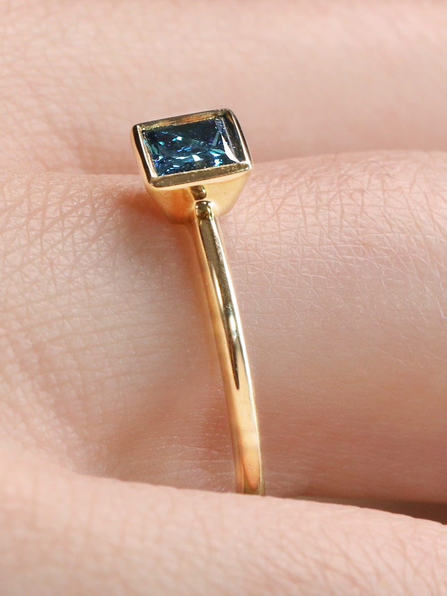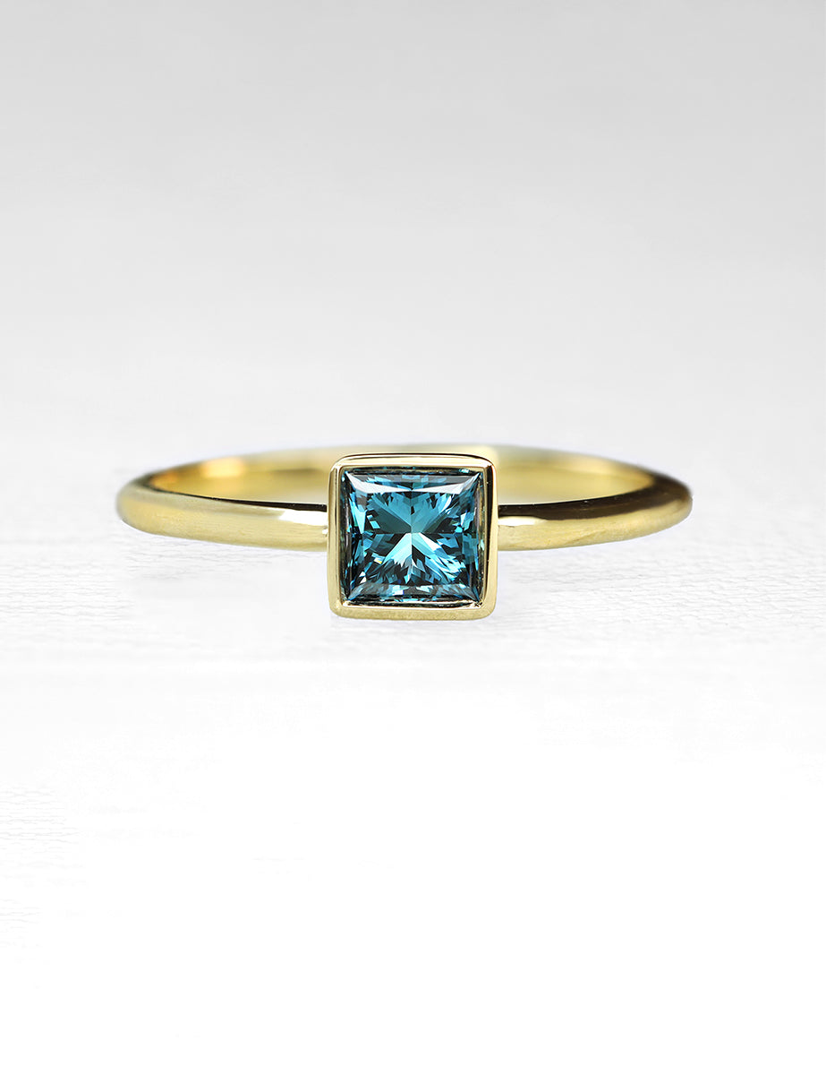 The crisp facets of this Princess Cut Blue Diamond are highlighted in this low profile bezel setting.