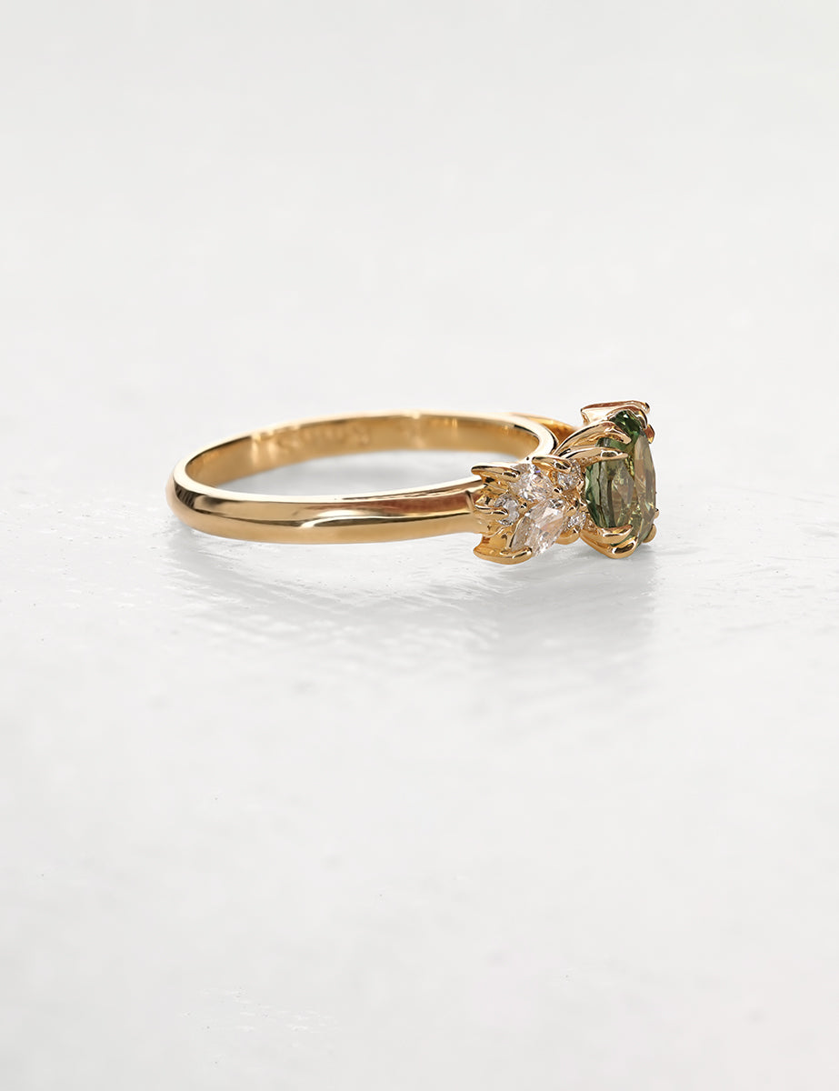 Monet is everything its name implies. A soft green Montana Sapphire is accented by a fan of marquise shaped diamonds.