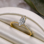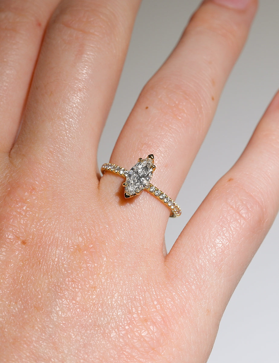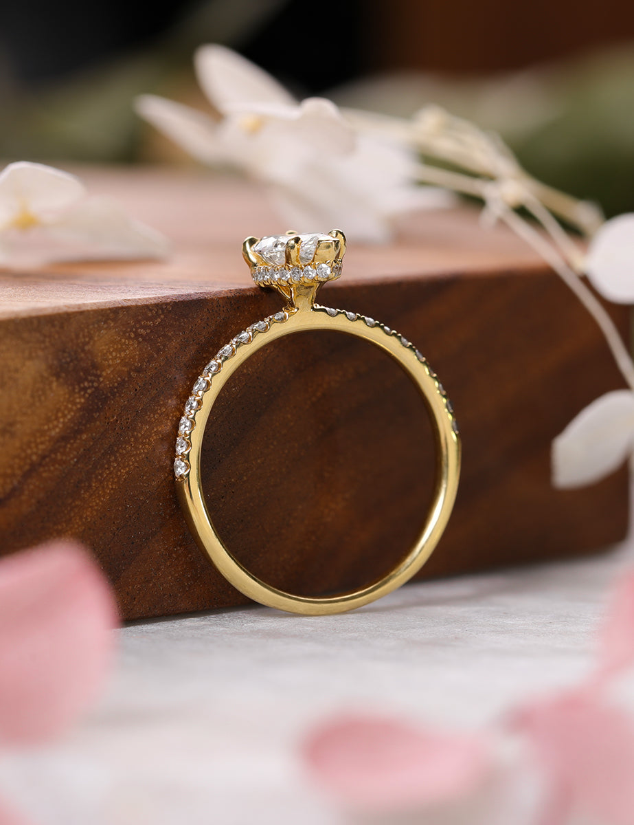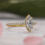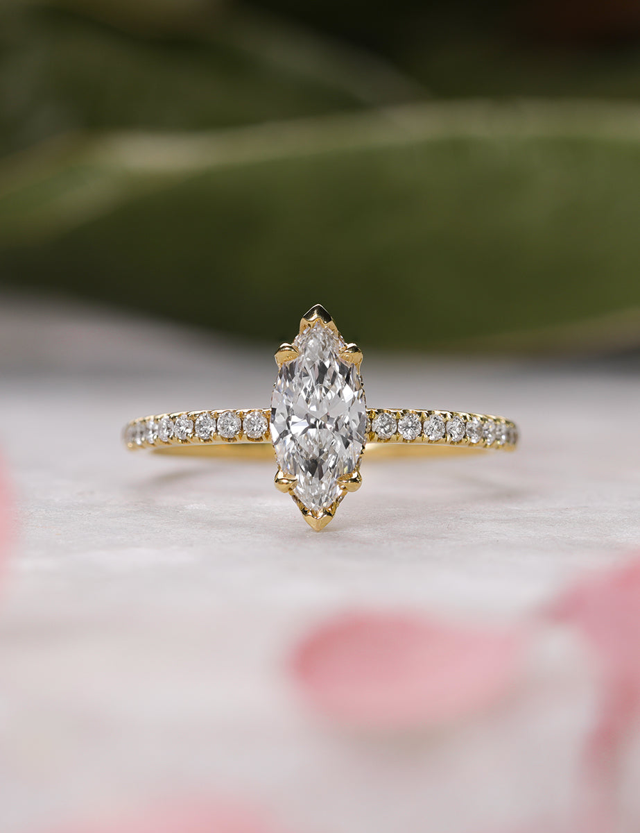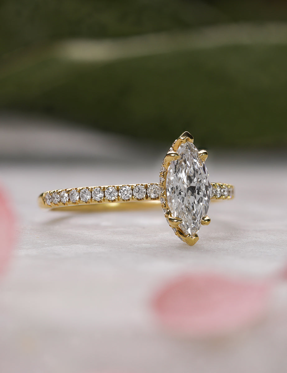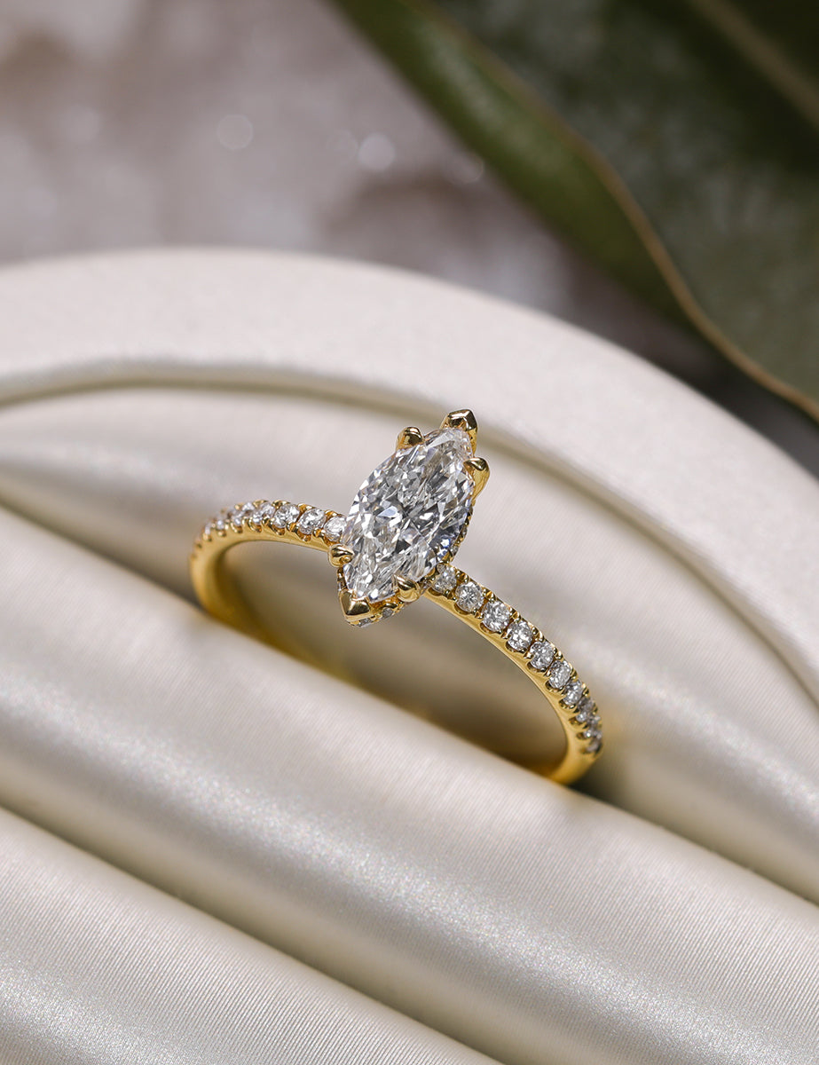 This classic engagement ring features sparkling scalloped pavé diamonds that extend three-fourths of the way around the ring. A diamond adorned hidden halo and graceful claw prongs embrace the center Lab Grown Marquise Diamond.