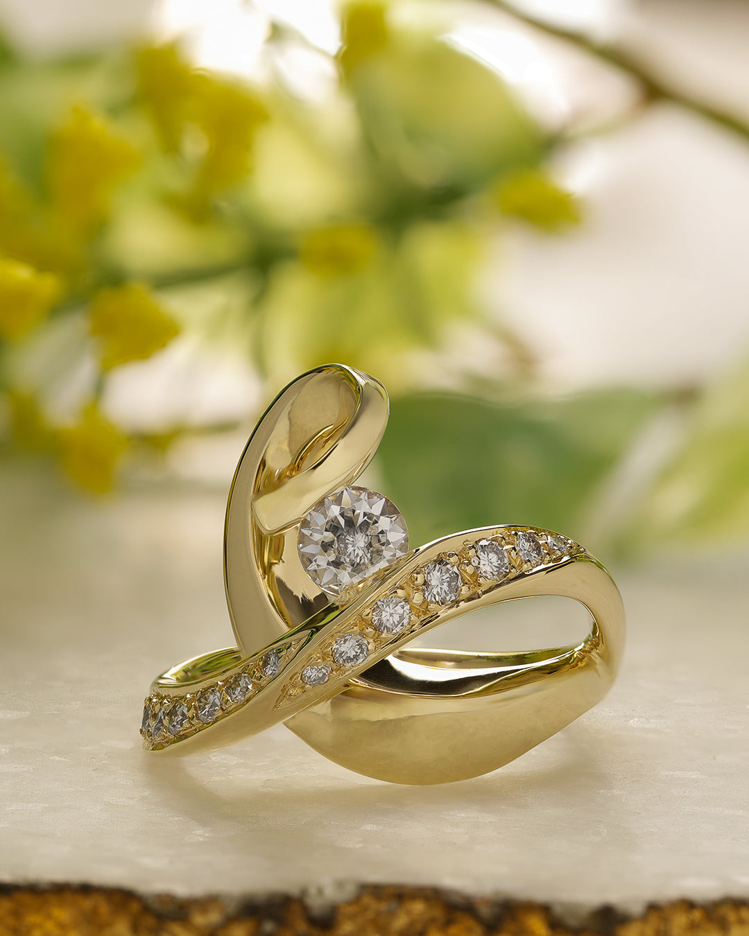 A Kirk’s Original design featuring sweeping arches of 14 karat yellow gold, highlighted by a brilliant 5mm round diamond and diamond accents for bright, modern sparkle.