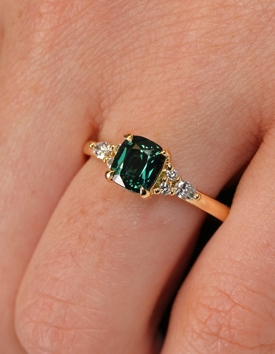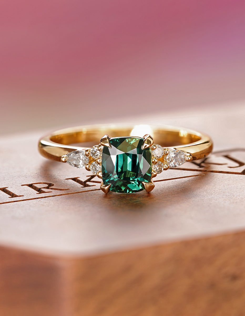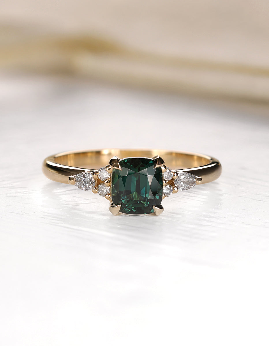 This elegant ring features a bright teal green cushion cut sapphire with cluster of round and marquise-shaped diamonds that rest upon the shoulders of the slightly tapered band. The center stone is held by four claw style prongs.