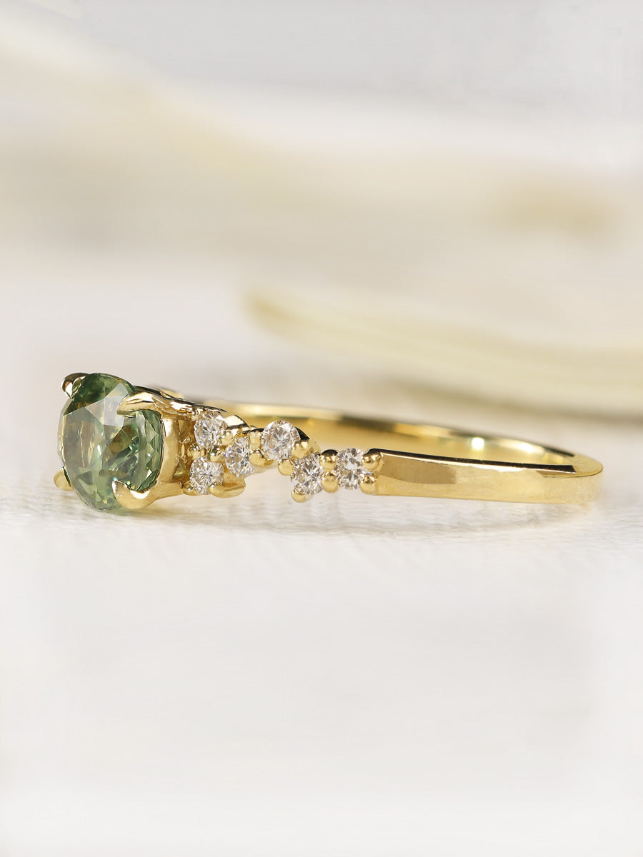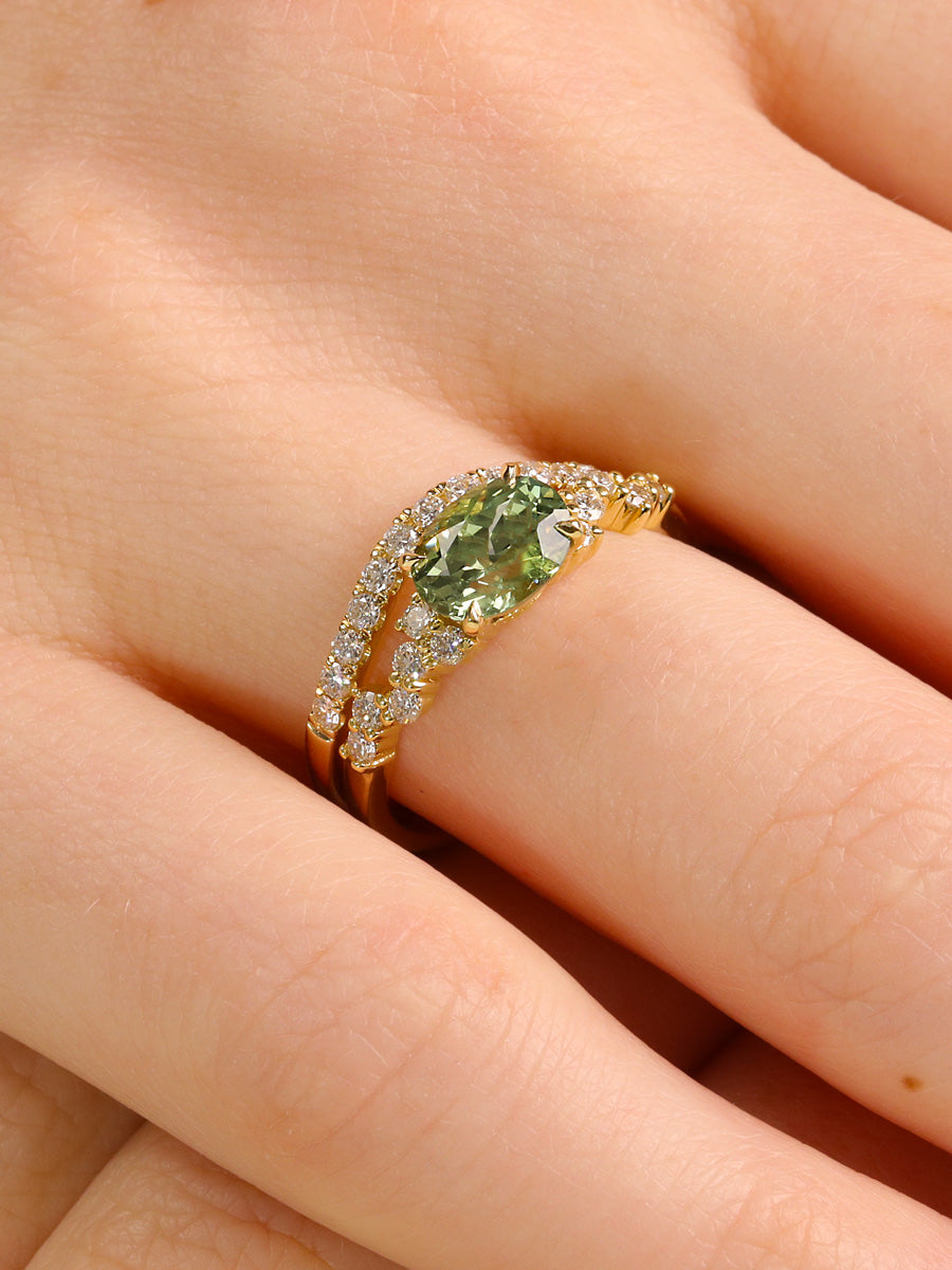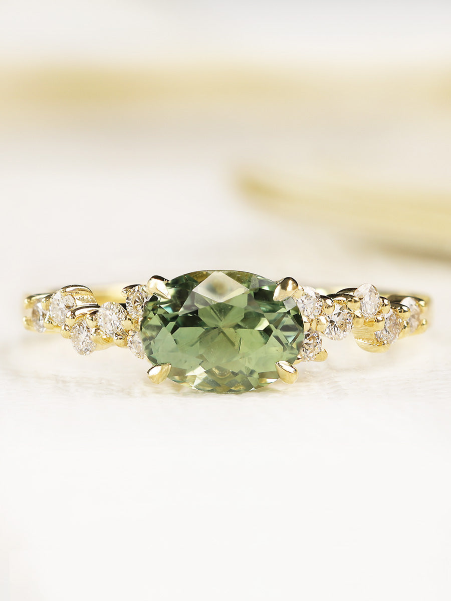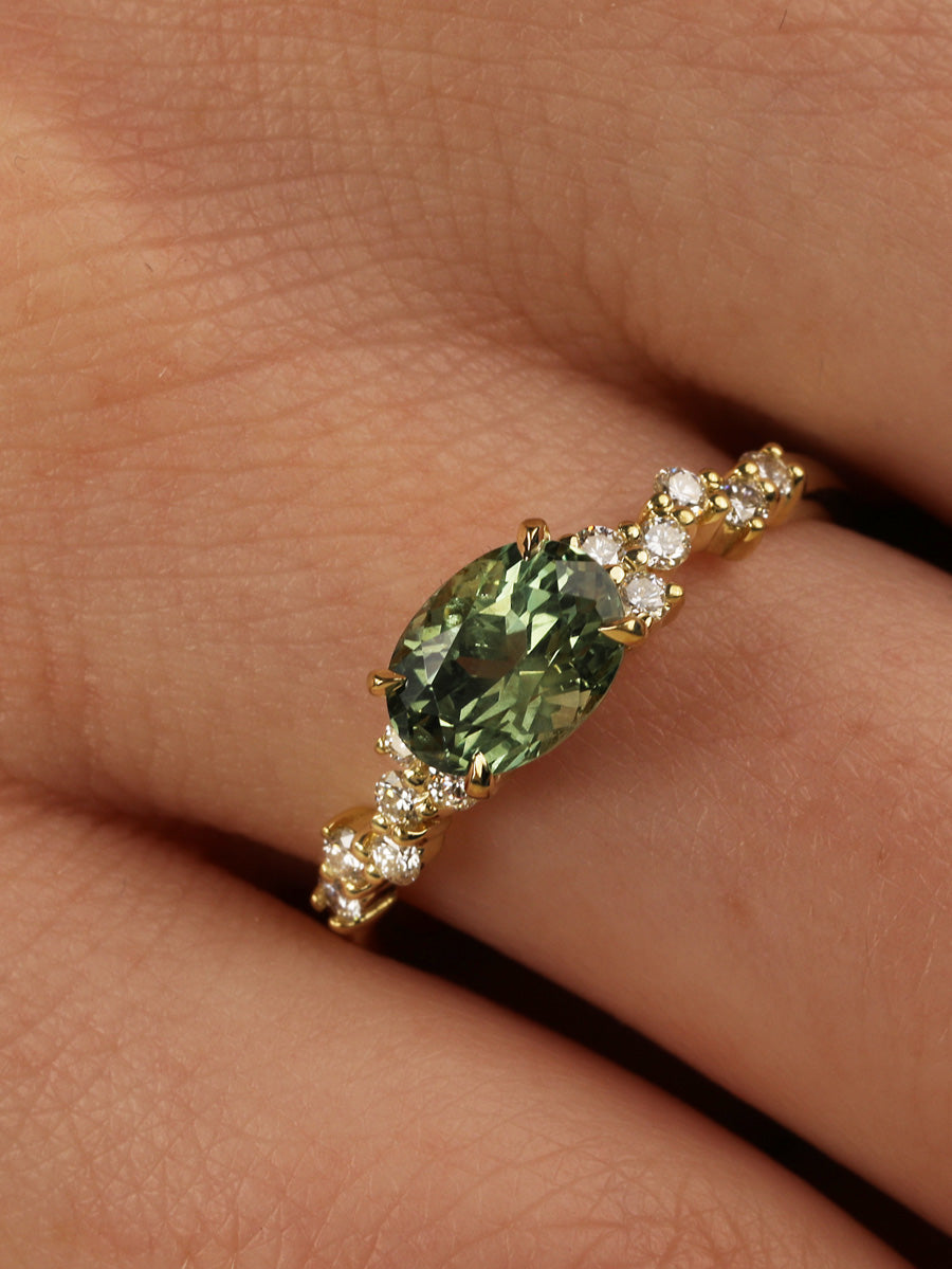 The alluring horizontal orientation of a Green Oval Montana Sapphire is accented by small round diamonds made to sparkle like the night sky.
