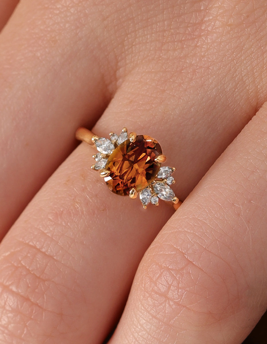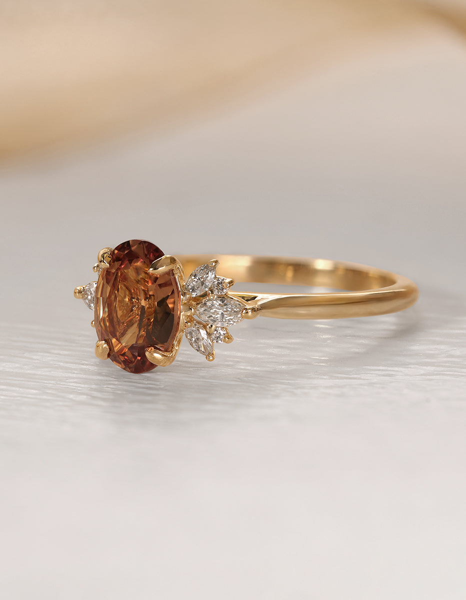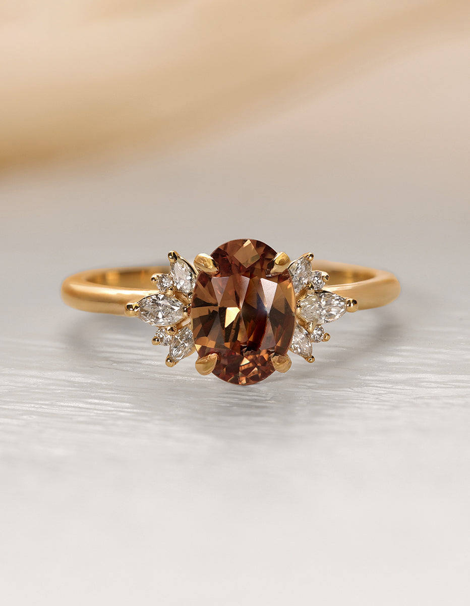 This one of a kind rich Cognac colored Sapphire features a cluster of round and marquise-shaped diamonds that rest upon the shoulders of the gently tapered band. The vivid color of this sapphire picks up peachy golden highlights with every move of your hand.