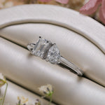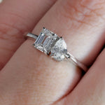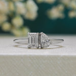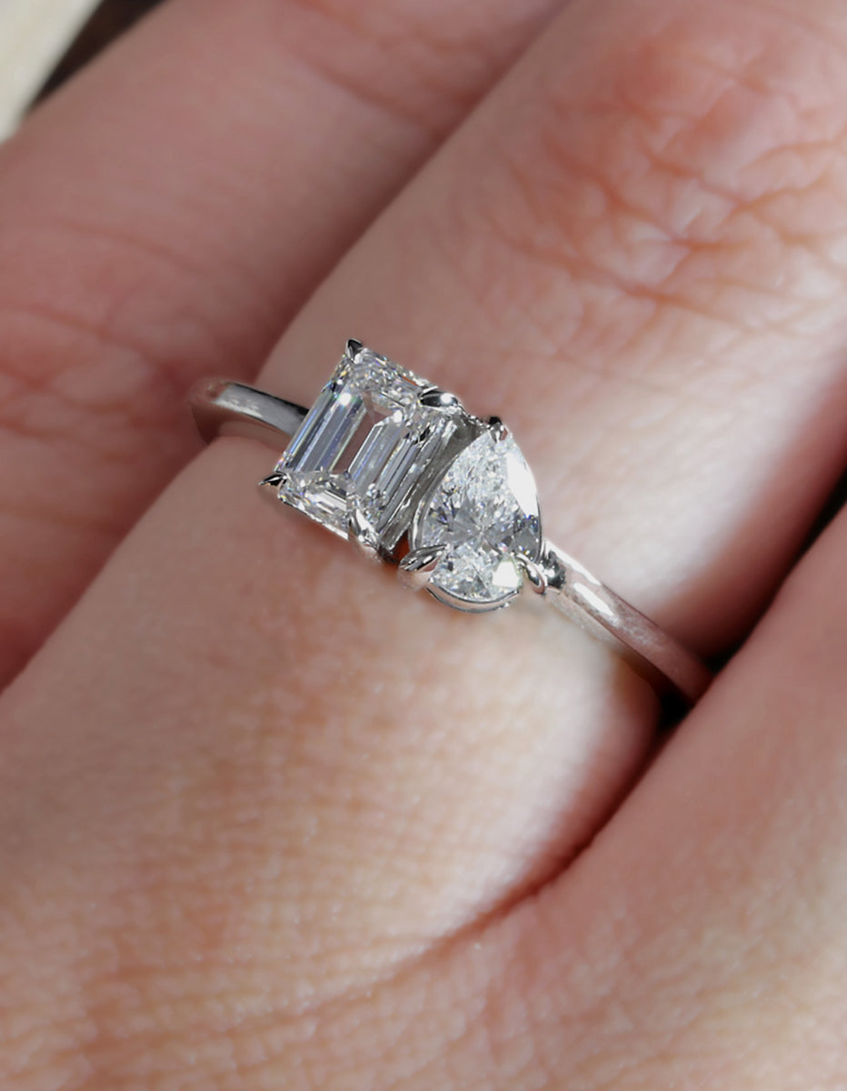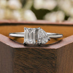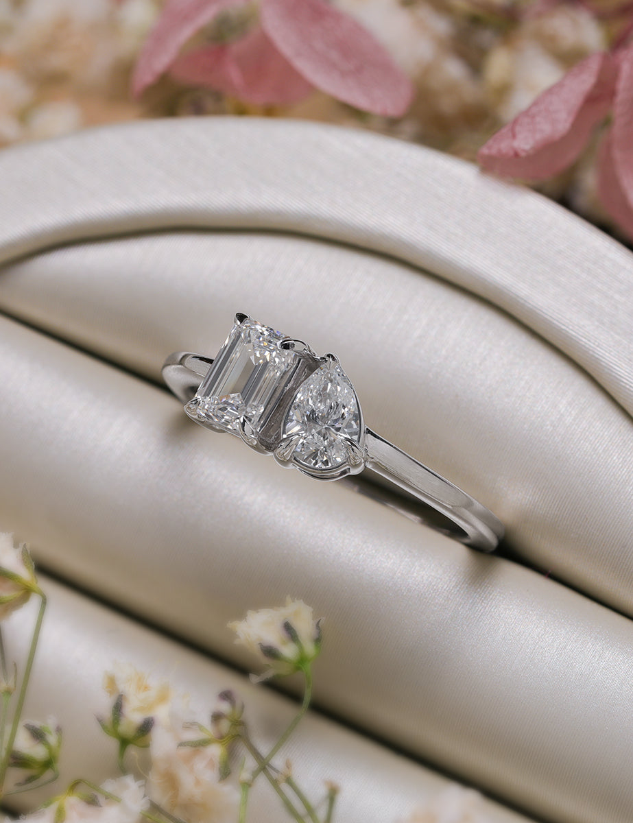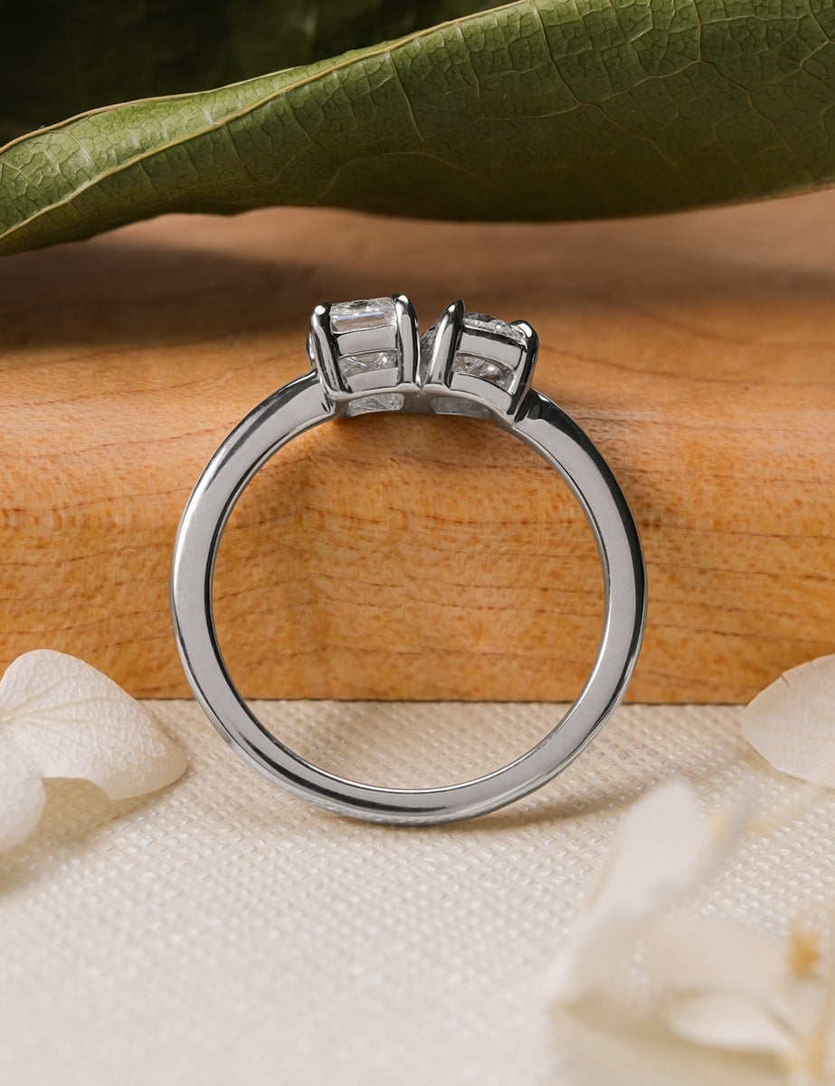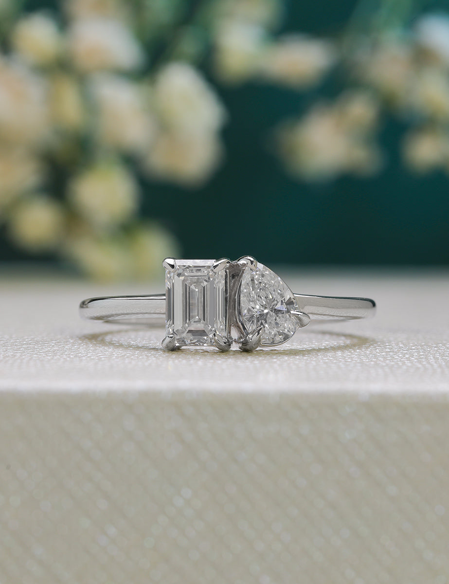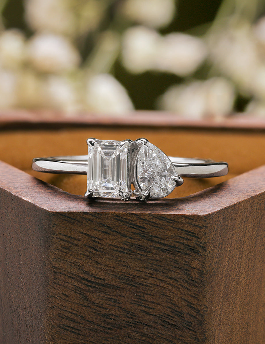 Translating from French to "You and Me", the Toi et Moi ring is a distinctive design that features a .50 carat emerald cut diamond and a .50 carat pear cut diamond side by side. The simple and delicate 14 karat band allows the diamond pair to take center stage. Designed by expert artisans, the Toi et Moi balances two unique focal stones, modeling grace and stability.