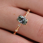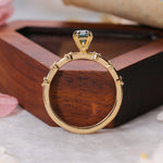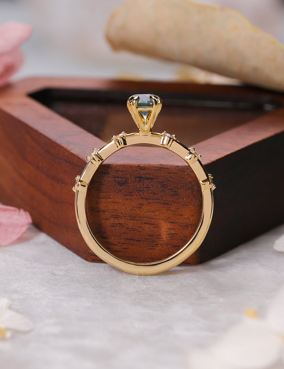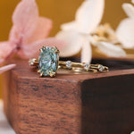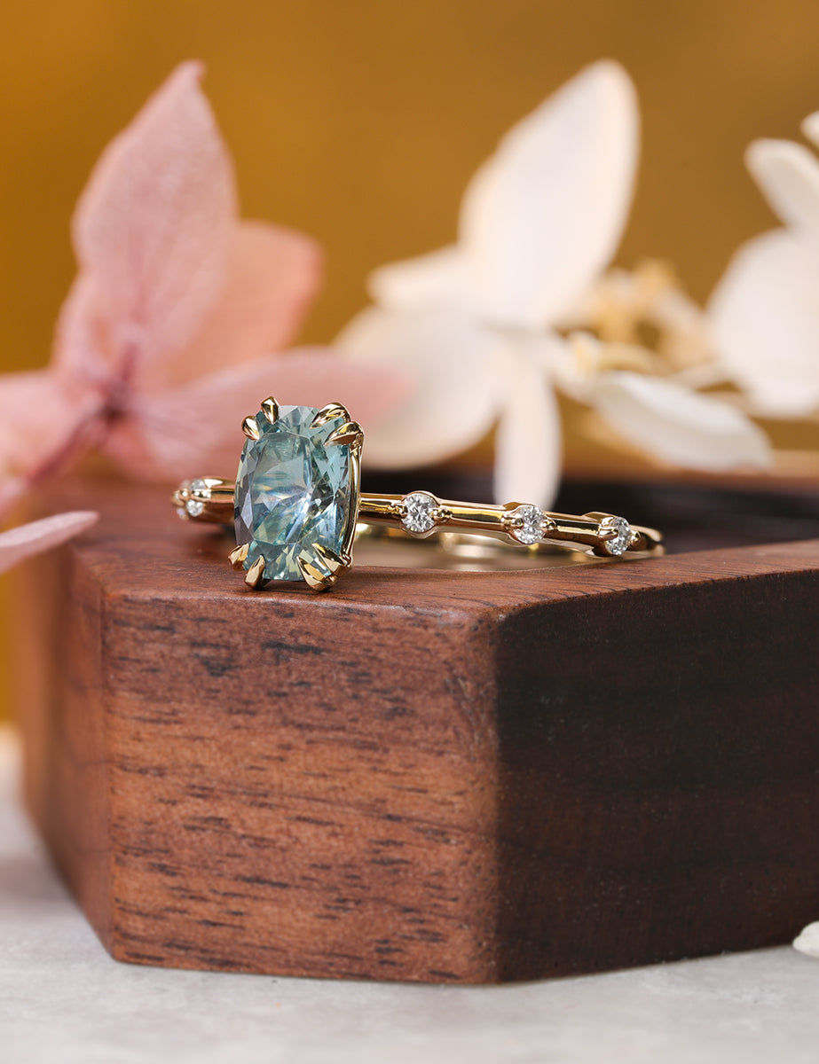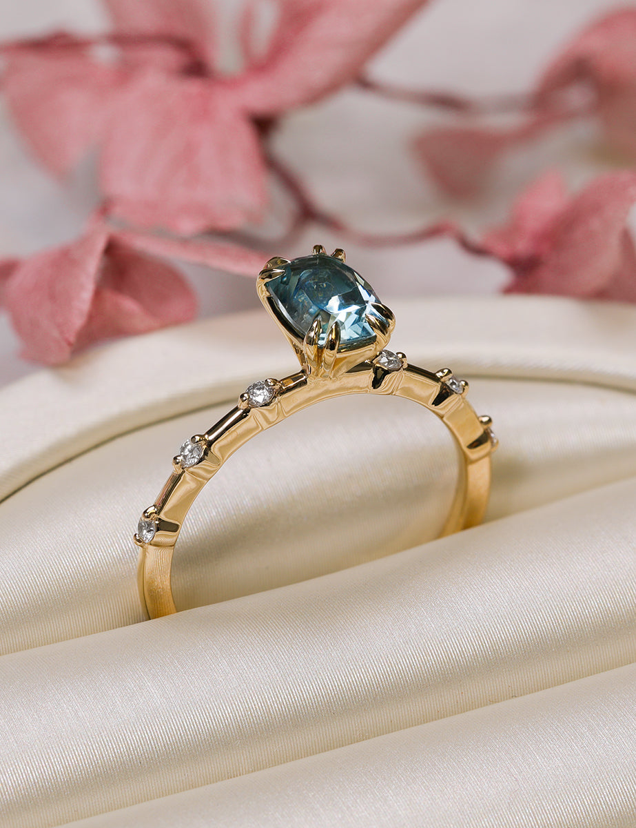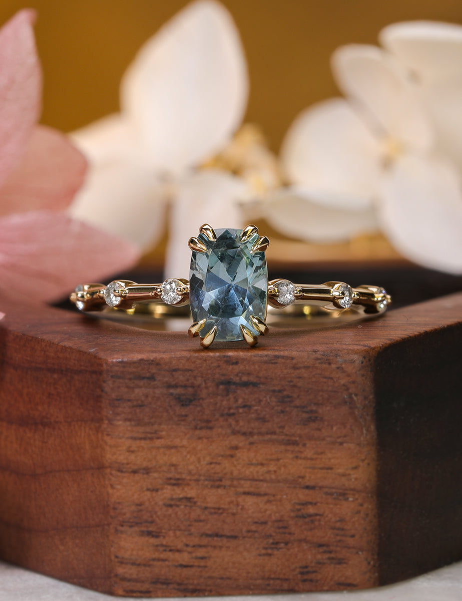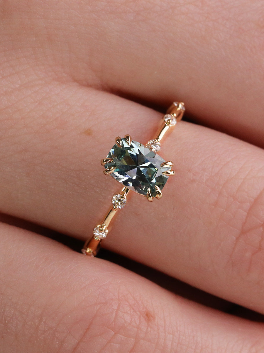 Stunning in design, the Cora features a cushion cut, light blue, 1.09 carat Montana Sapphire. Along the ultra thin shank are a total of six prong-set round cut diamonds that extend halfway down the band, three on either side of the focal stone. A sophisticated and understated ring, the Cora only serves to complement the wearer without outshining them. Although the Cora is crafted to look delicate and dainty, our expert artisans ensure high quality stability.