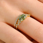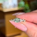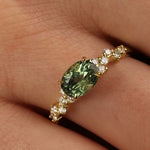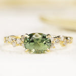 The alluring horizontal orientation of a Green Oval Montana Sapphire is accented by small round diamonds made to sparkle like the night sky.