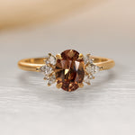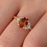 This one of a kind rich Cognac colored Sapphire features a cluster of round and marquise-shaped diamonds that rest upon the shoulders of the gently tapered band. The vivid color of this sapphire picks up peachy golden highlights with every move of your hand.