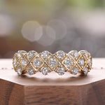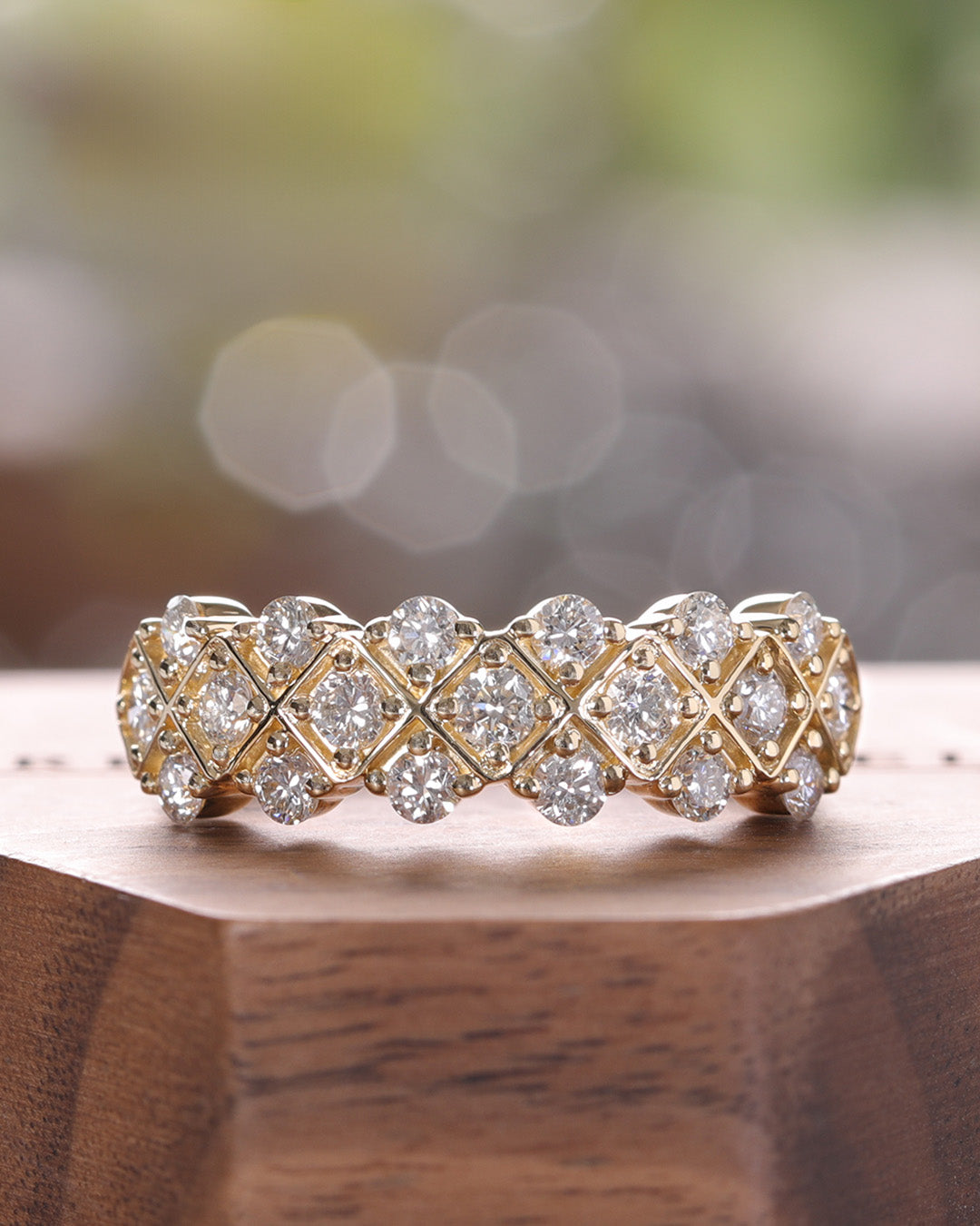 Celebrate brilliance with this stunning 14K yellow gold woven diamond band! Crafted with 19 dazzling diamonds (.97 tcw) woven into an intricate, eye-catching design, this ring sparkles with playful sophistication.
