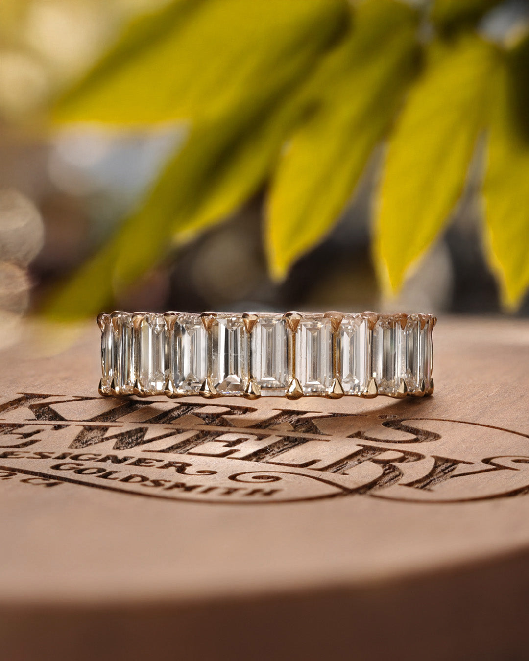 A bold baguette diamond band crafted in warm 14 karat yellow gold, featuring lab grown diamonds for clean, modern sparkle.
