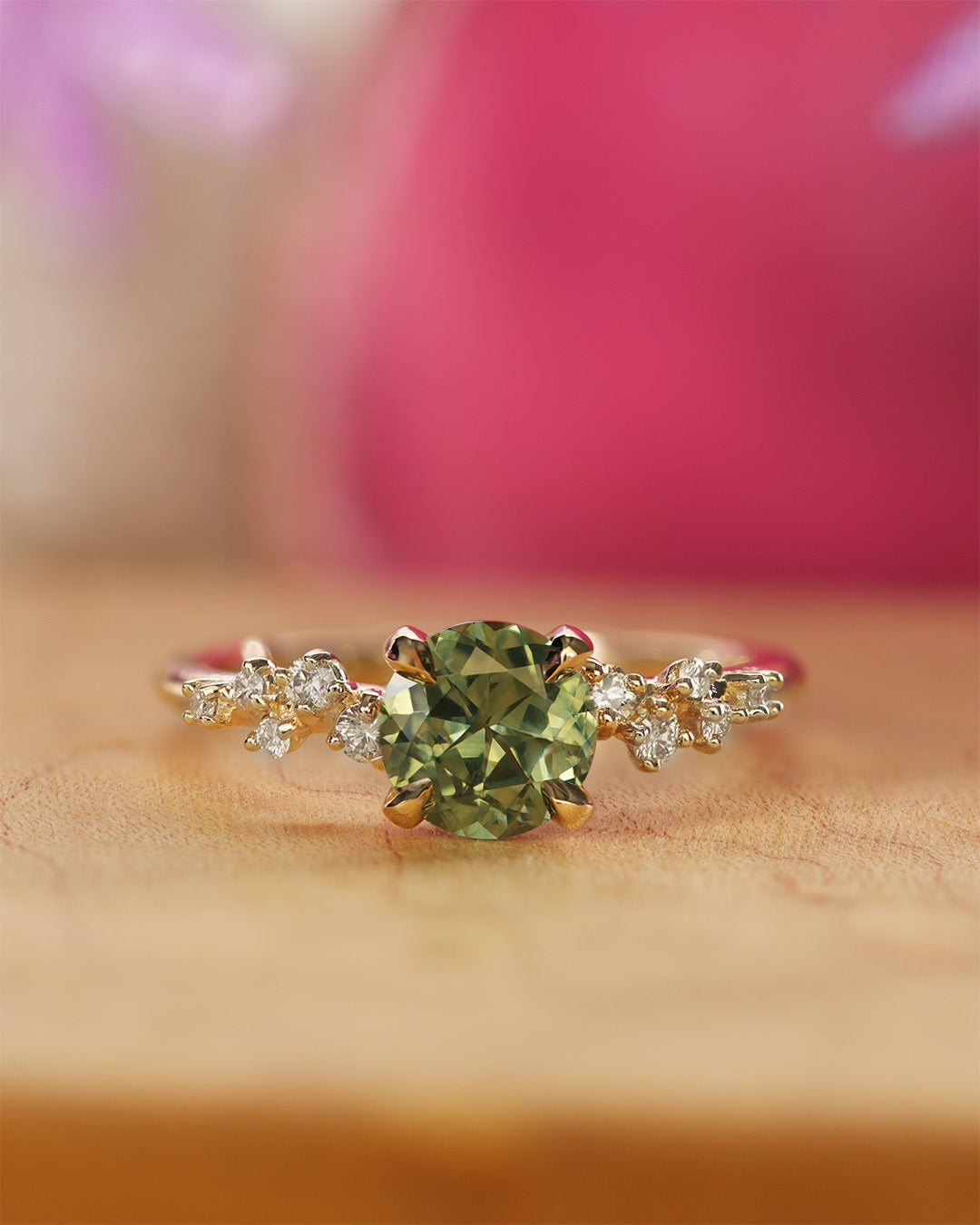 The Moonlight glistens with a Green Blue round Montana Sapphire focal point and diamond accented band.