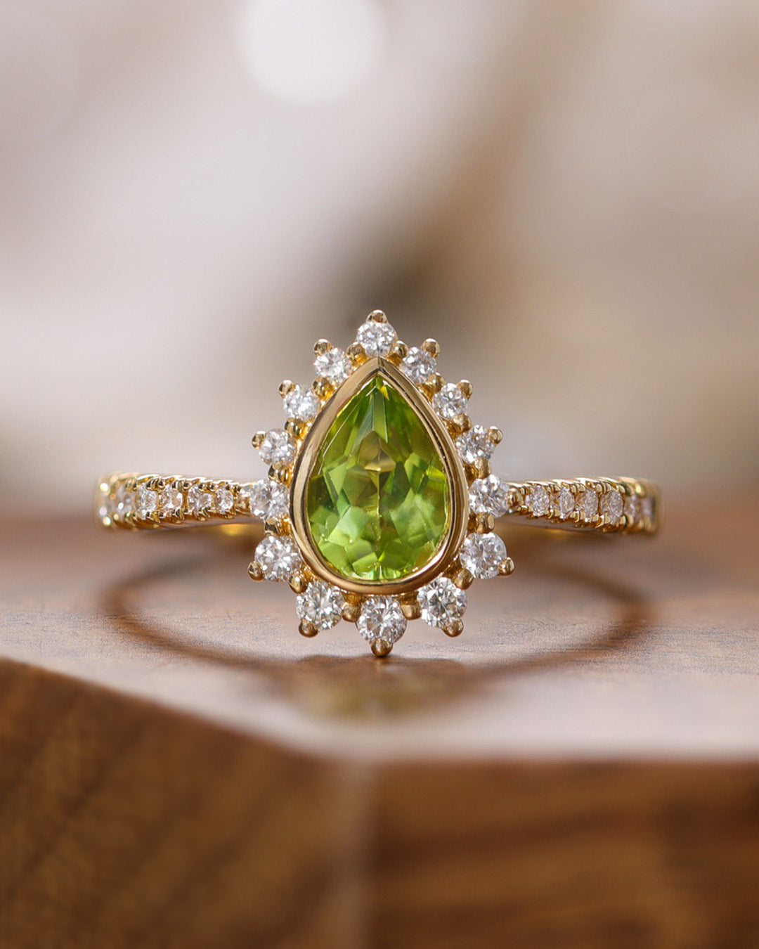 A bright pear shape peridot is framed by a sparkling diamond halo for a fresh pop of color in warm 14 karat yellow gold.