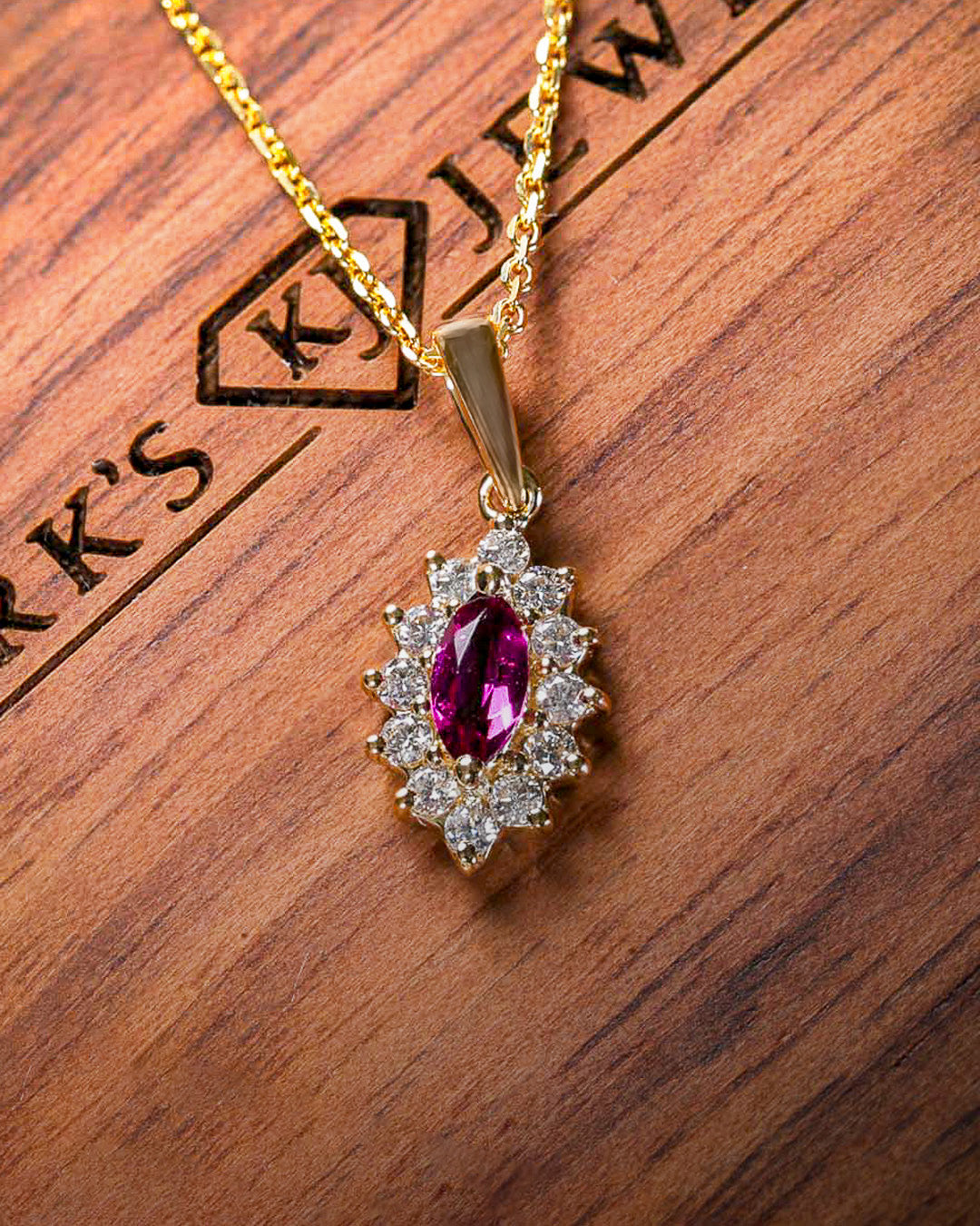 Discover refined elegance with this garnet halo pendant, featuring a captivating deep crimson garnet at its heart, framed by a constellation of sparkling diamonds in warm yellow gold. The sophisticated design balances bold color with understated luxury, creating a piece that transcends trends. Whether layered with delicate chains or worn as a standalone focal point, this pendant speaks to those with refined taste and an appreciation for distinctive gemstone jewelry. A timeless treasure for the modern collector.