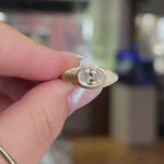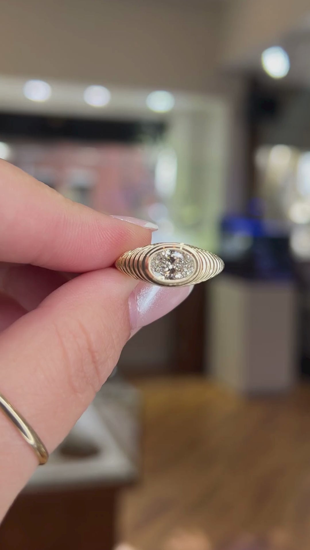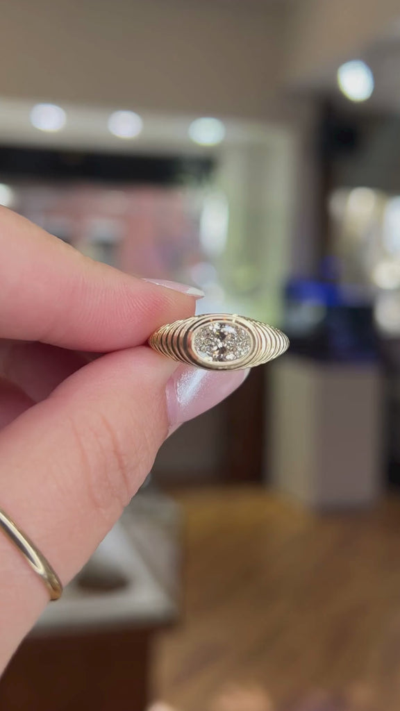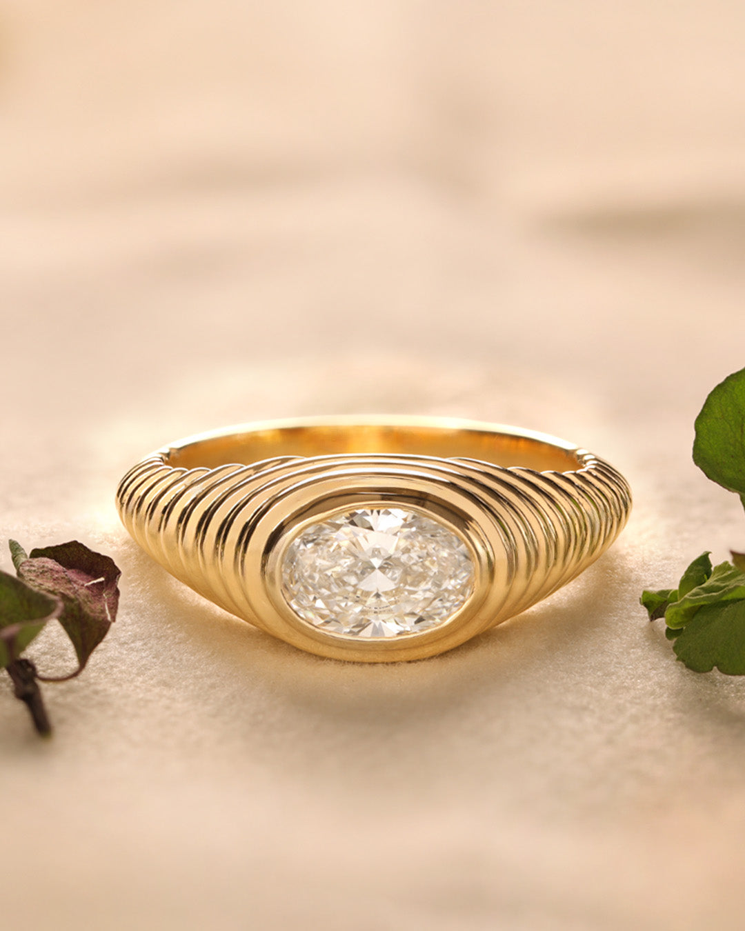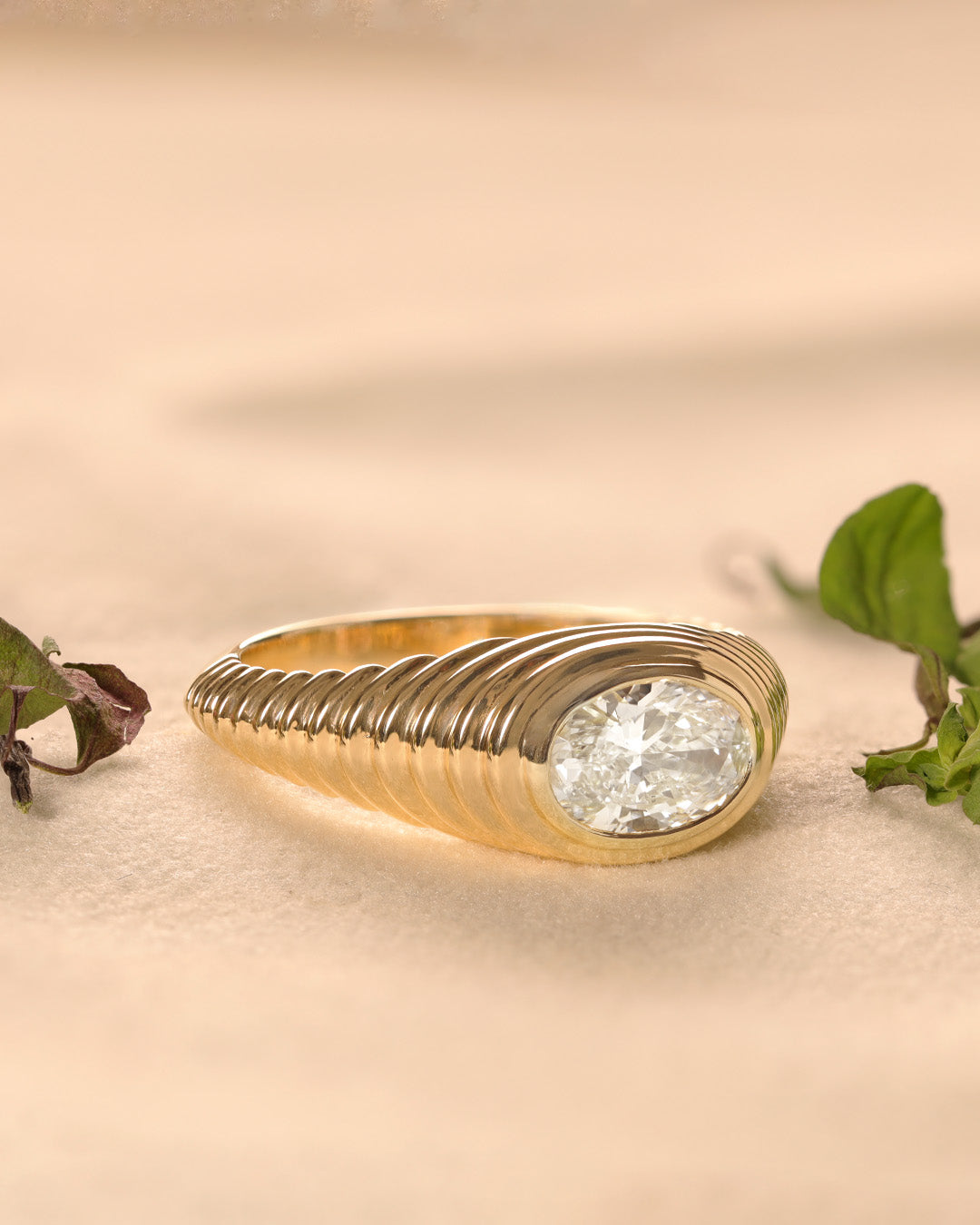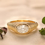 The Clara captures timeless elegance with its ribbed vintage design and stunning oval diamond set in the east-to-west orientation. This classic silhouette showcases refined craftsmanship, featuring delicate ribbed detailing that adds texture and depth to the band. Perfect for those who appreciate vintage-inspired jewelry with a modern sensibility.