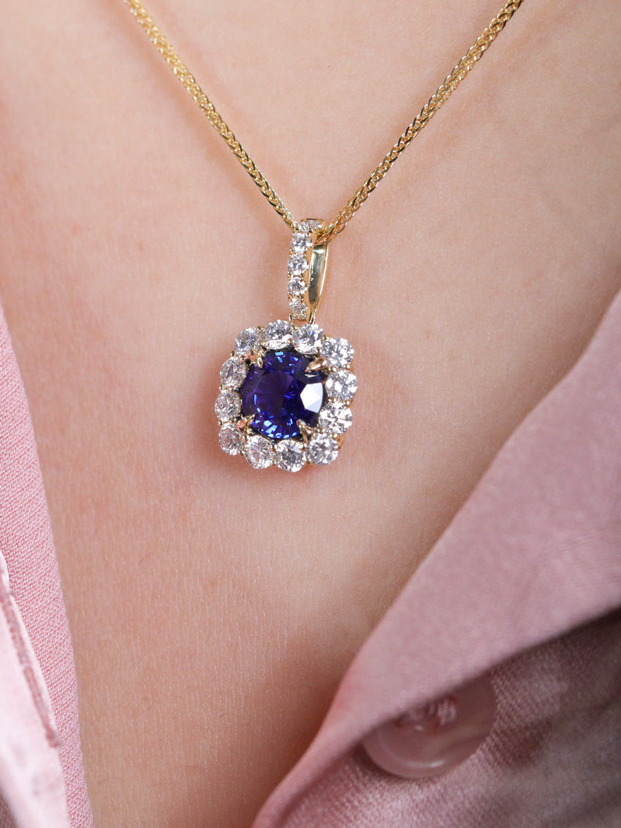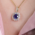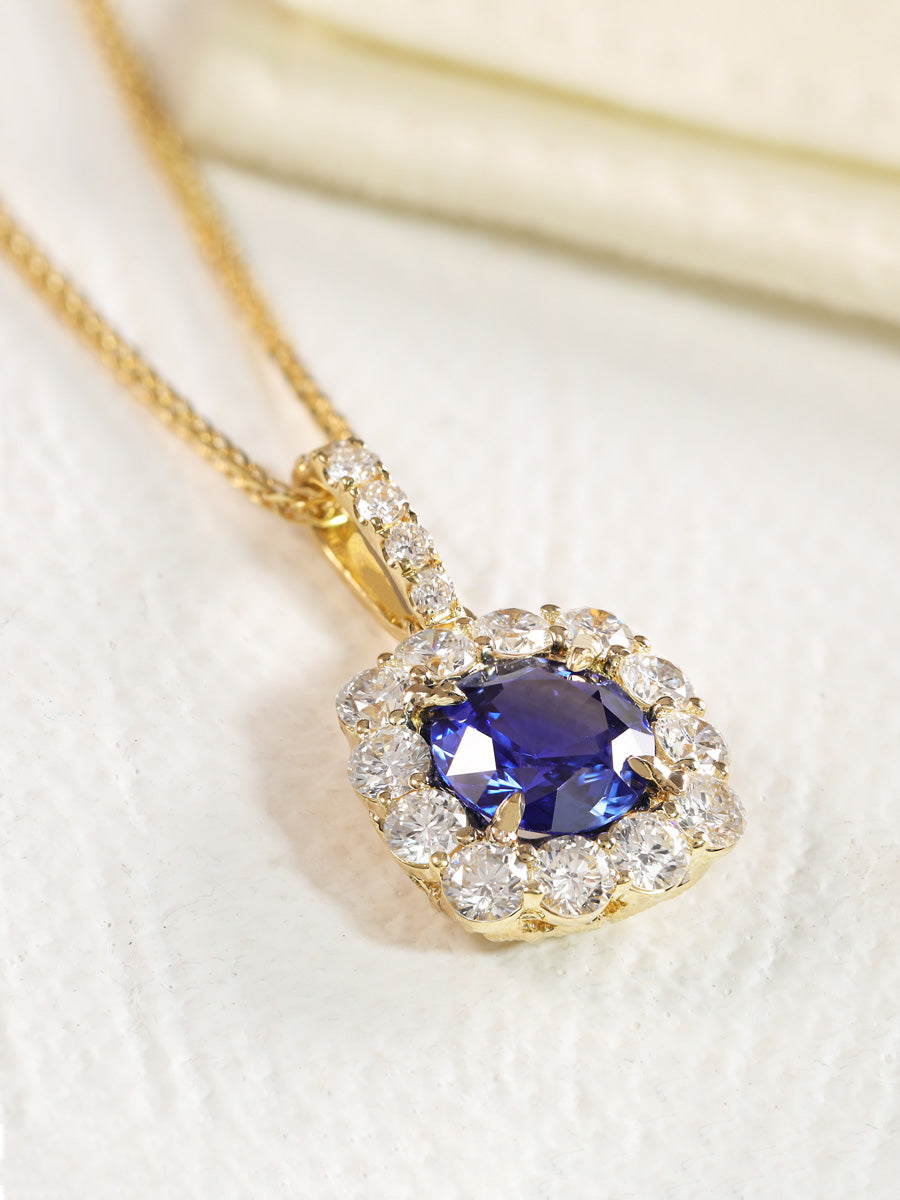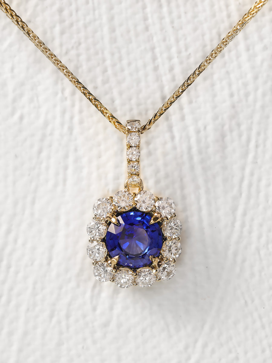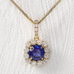 A vibrant blue sapphire centers this stunning necklace, embraced with sparkling, prong-set diamond accents and is paired with an 18" 18 karat yellow gold wheat chain.