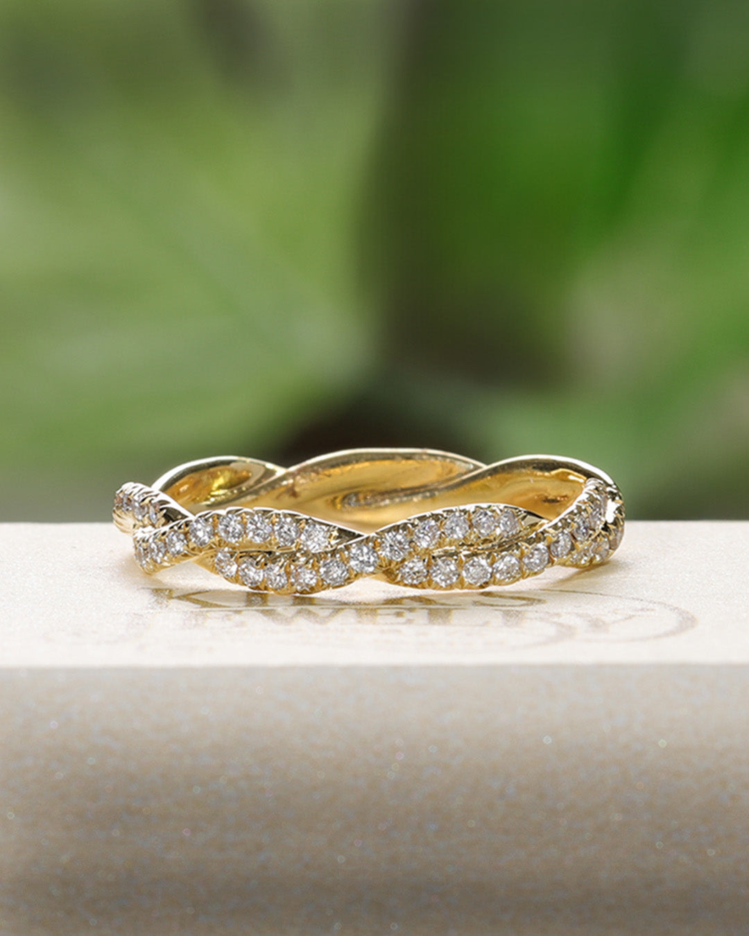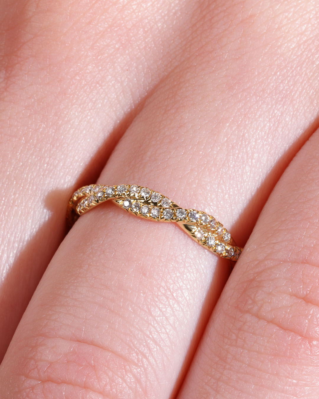 A classic braided band design finished with pavé set diamonds for soft sparkle in warm 18 karat yellow gold.