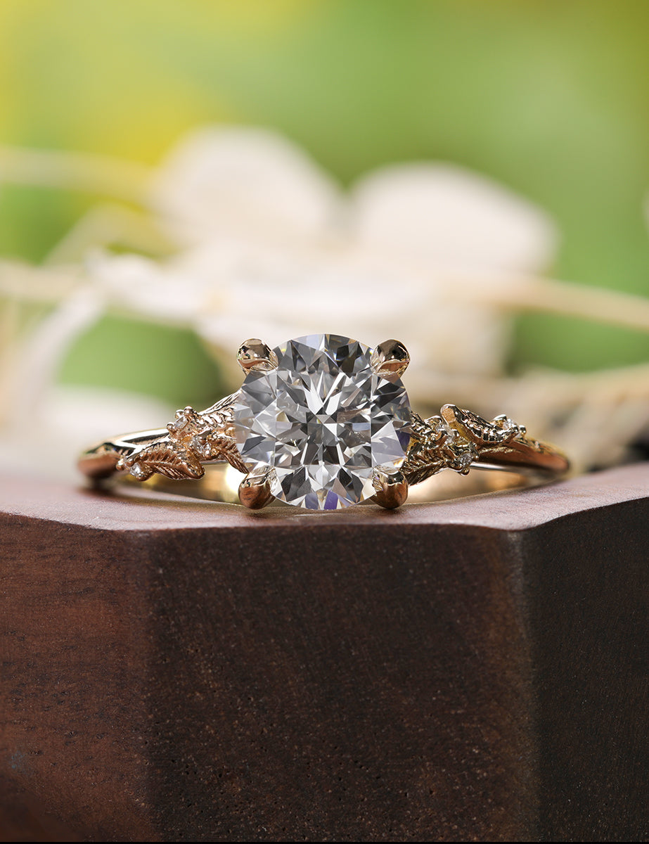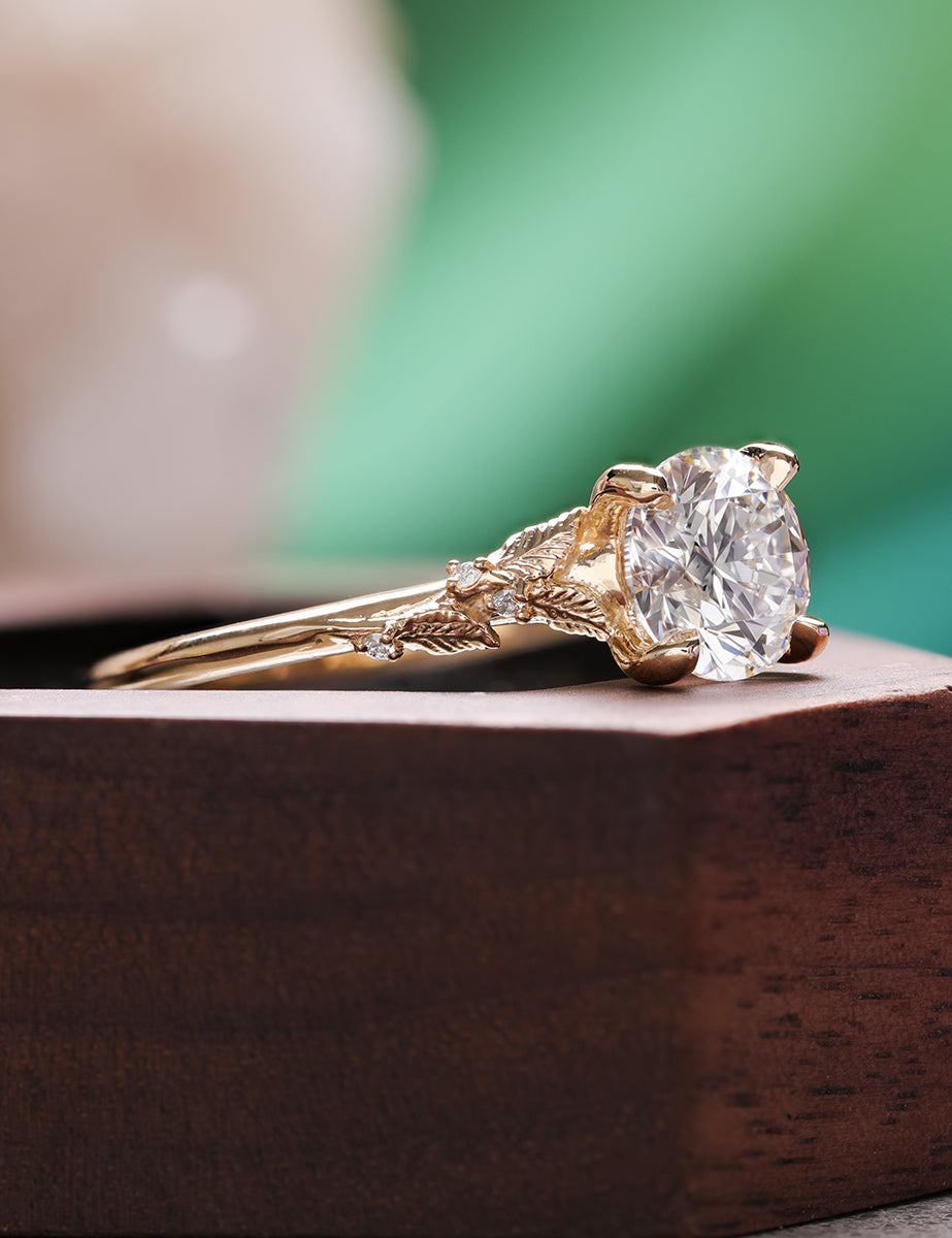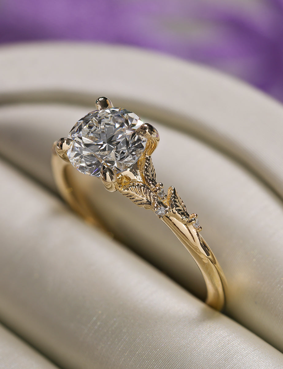 Modeled after the timeless beauty of mother nature, the Linden features an round cut 1.42 carat diamond perched between a delicate leaf design. Intricately dotted among the leaves are round accent diamonds, enhancing the sparkle of this elegant 14 karat yellow gold band. A hidden diamond can be found nestled at the base of the focal stone where the uniquely designed center basket gently separates, adding a charmingly secret sparkle. Pair with the matching Linden wedding band to exude a natural glamour.