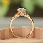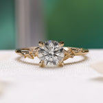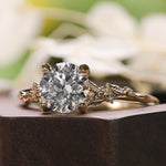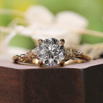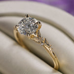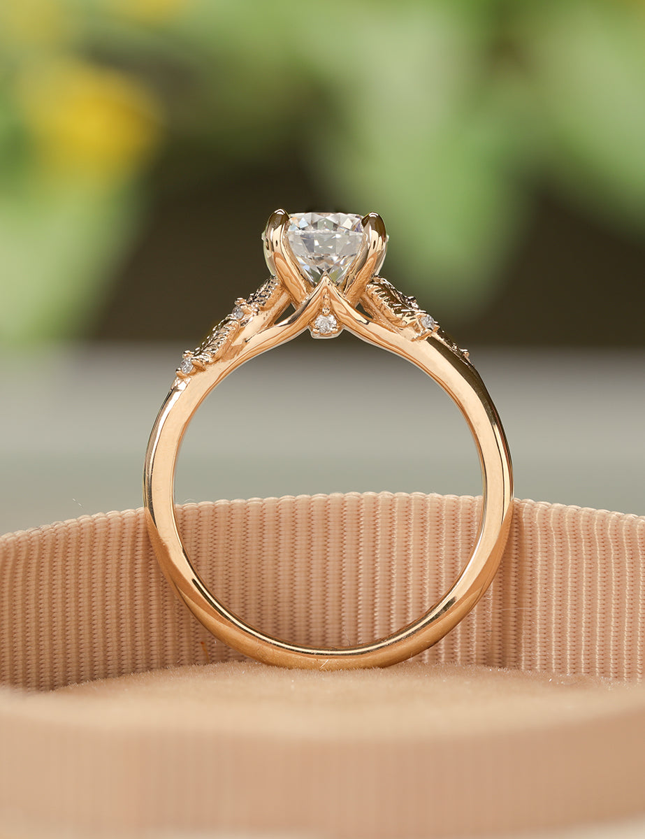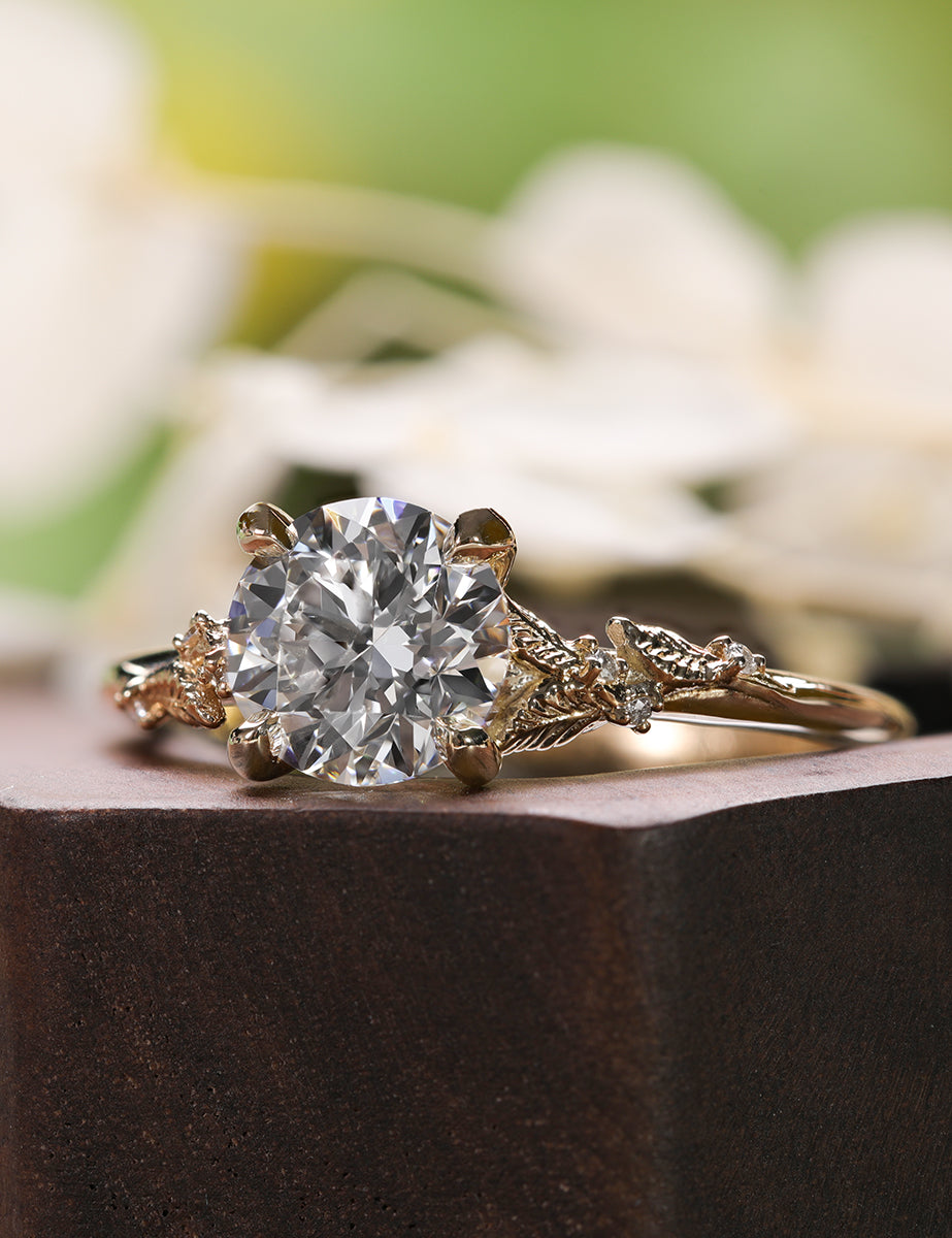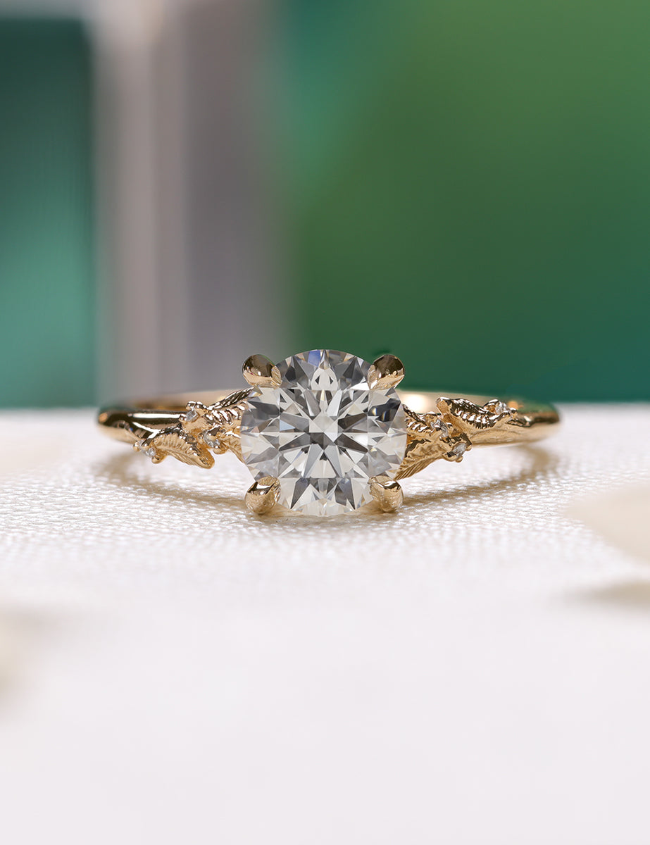 Modeled after the timeless beauty of mother nature, the Linden features an round cut 1.42 carat diamond perched between a delicate leaf design. Intricately dotted among the leaves are round accent diamonds, enhancing the sparkle of this elegant 14 karat yellow gold band. A hidden diamond can be found nestled at the base of the focal stone where the uniquely designed center basket gently separates, adding a charmingly secret sparkle. Pair with the matching Linden wedding band to exude a natural glamour.