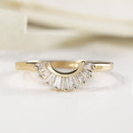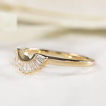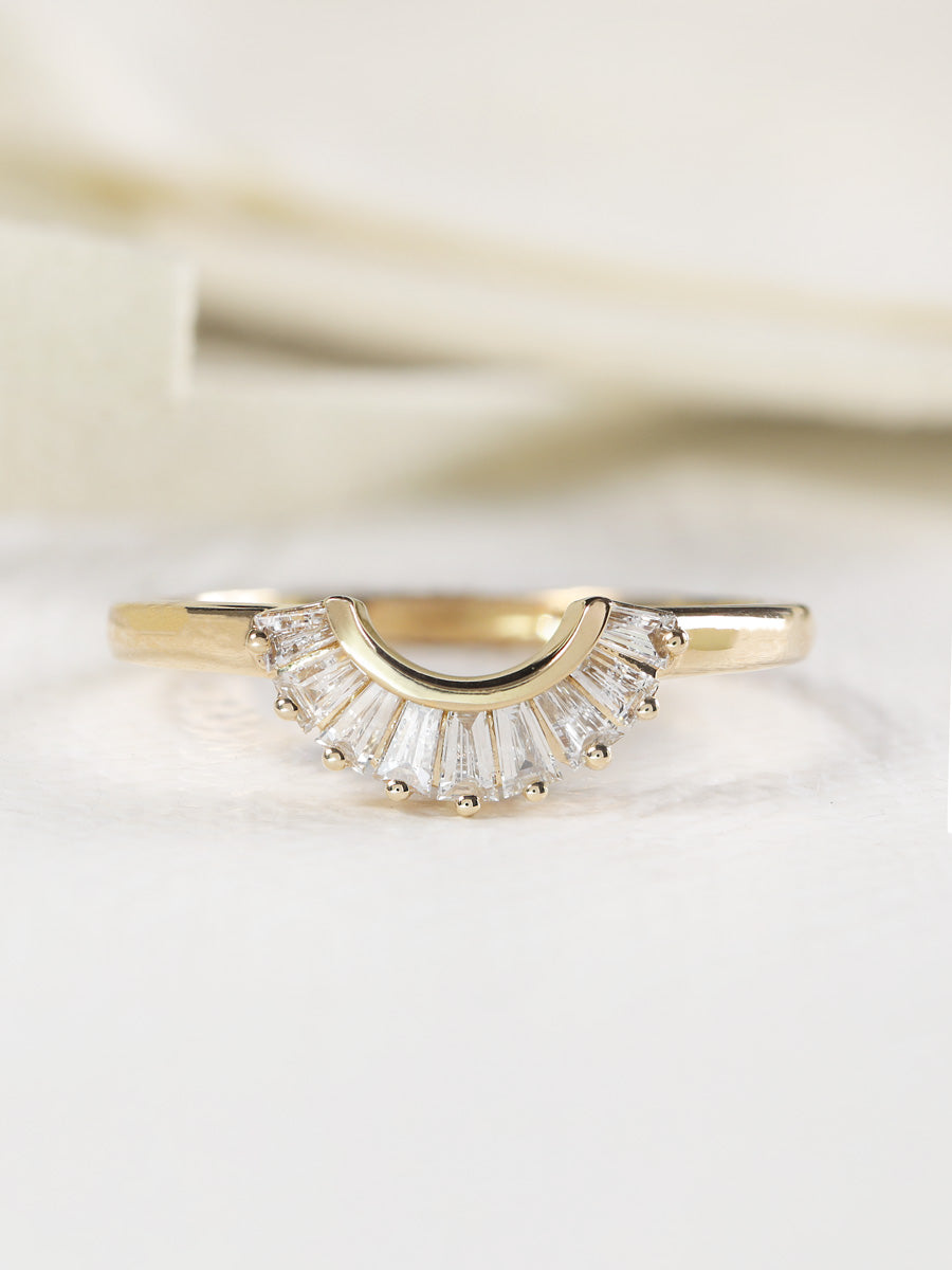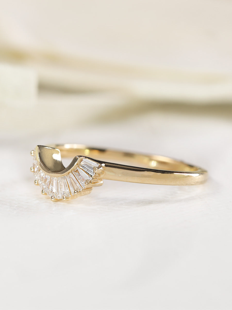 Tapered baguette diamonds create a unique arc in this whimsical contoured ring. Crafted to sit perfectly flush with many engagement styles or make a bold statement on its own.
