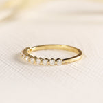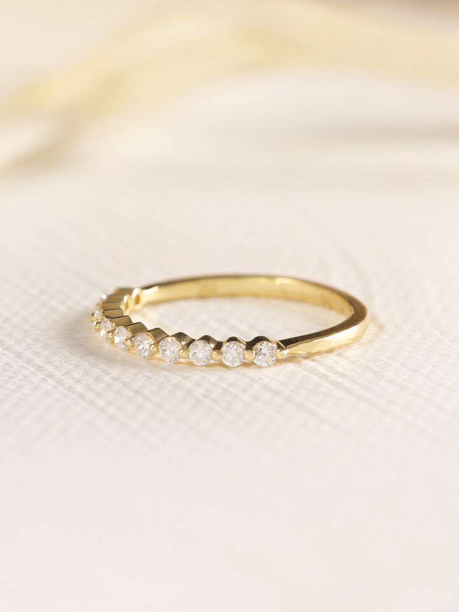 Round diamonds create a scalloped look on the finger, ideal as a wedding or stacking ring.