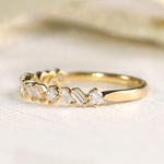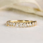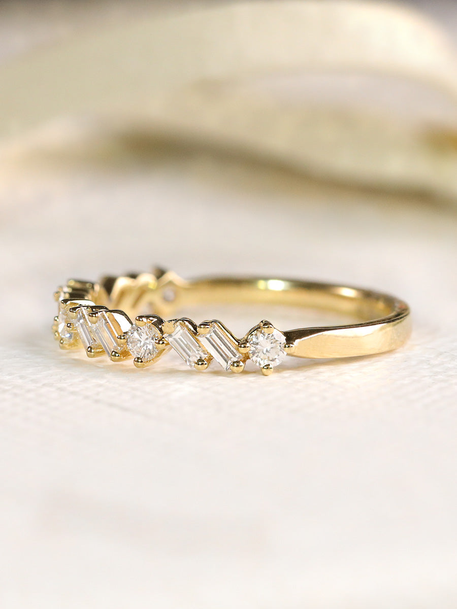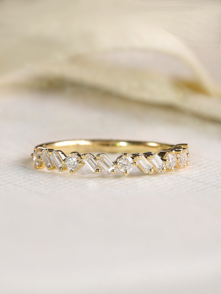 This beautiful ring evokes romance with scattered round and baguette-shaped natural mined diamonds that shimmer along half the band.