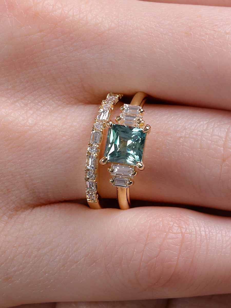 Baguette diamonds in a scalloped pavé setting glimmer along the top half of this ring while round diamond accents complete the pattern.