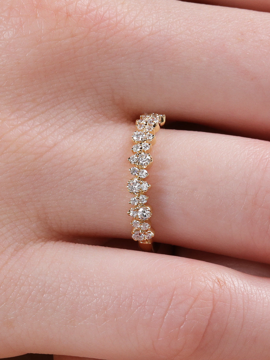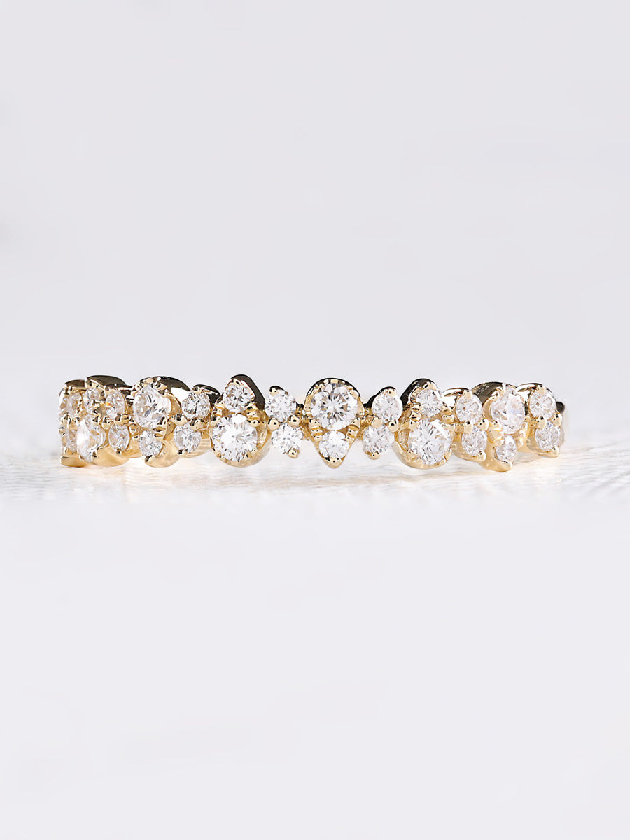 Round diamonds sit in a pear shape outline for a whimsical look.